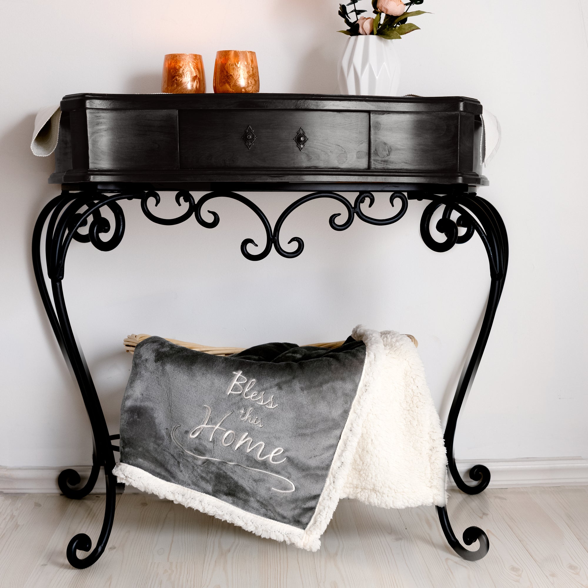 - IN-HOUSE DESIGN: The double-sided blanket has a debossed white embroidered "bless this home" sentiment matched by a scroll pattern on the gray plush side of the blanket. The aromatherapeutic candle has a white "bless this home" sentiment and scroll design. Socks have a gray ankle, heel, and toe accompanied by a heart and swirl design on a white sock base.