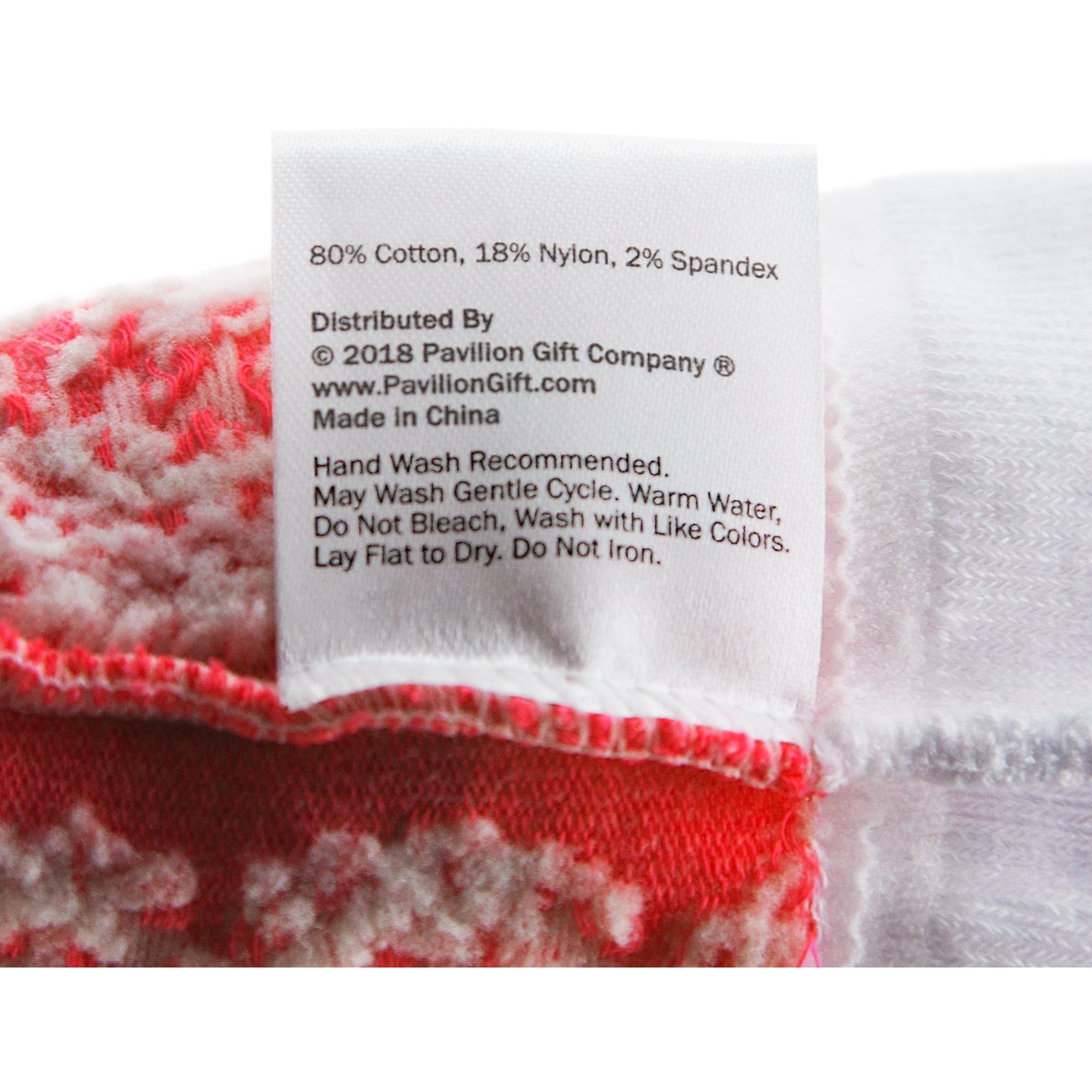 • IN-HOUSE DESIGN: "Let It Snow" text tag is sewn onto a solid white band under a red pattern.