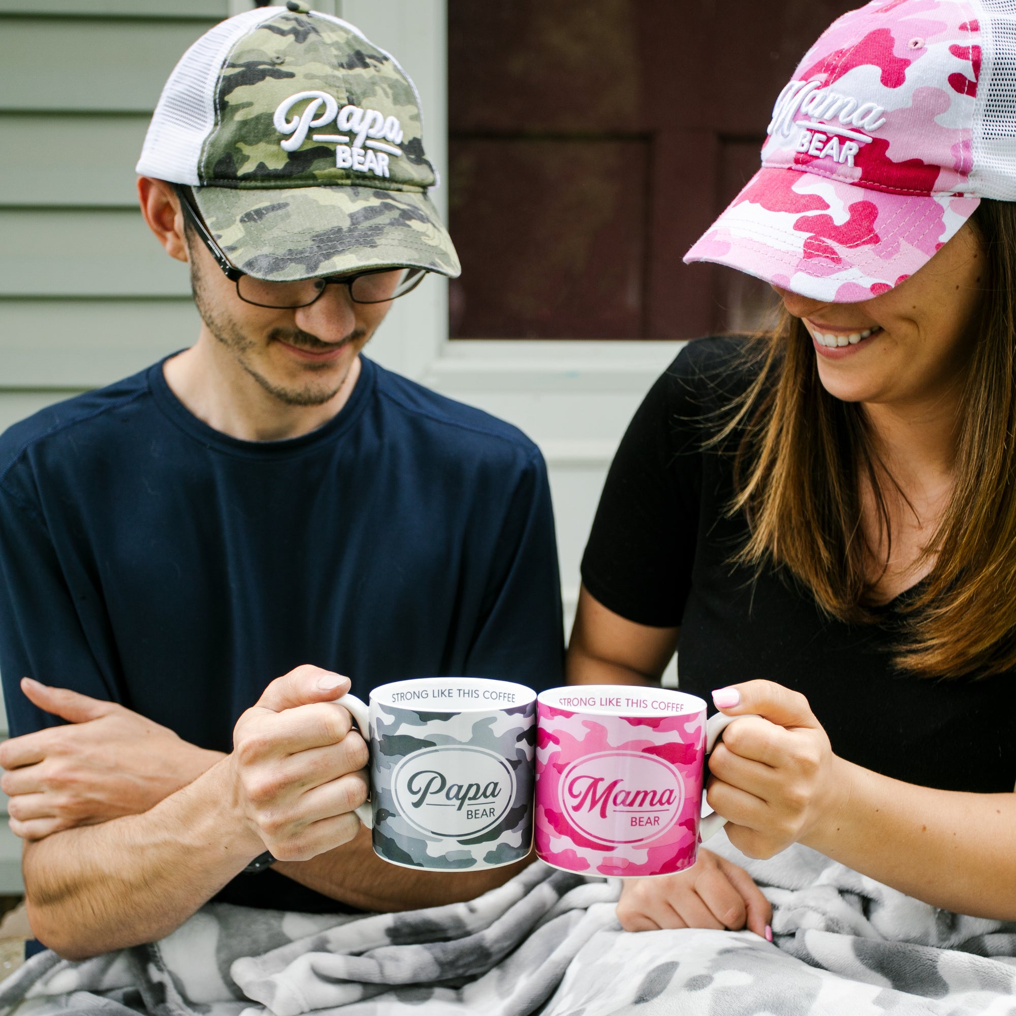 - IN-HOUSE DESIGN: "Papa Bear" and "Mama Bear" texts are printed on the front of the mugs, and "Strong Like This Coffee" is applied to the interior of the mugs in gray and pink coordinating colors. A combination of 4 different gray and pink tons are used to make up the exterior camo patterns. The interior of the mugs is all white cream color.