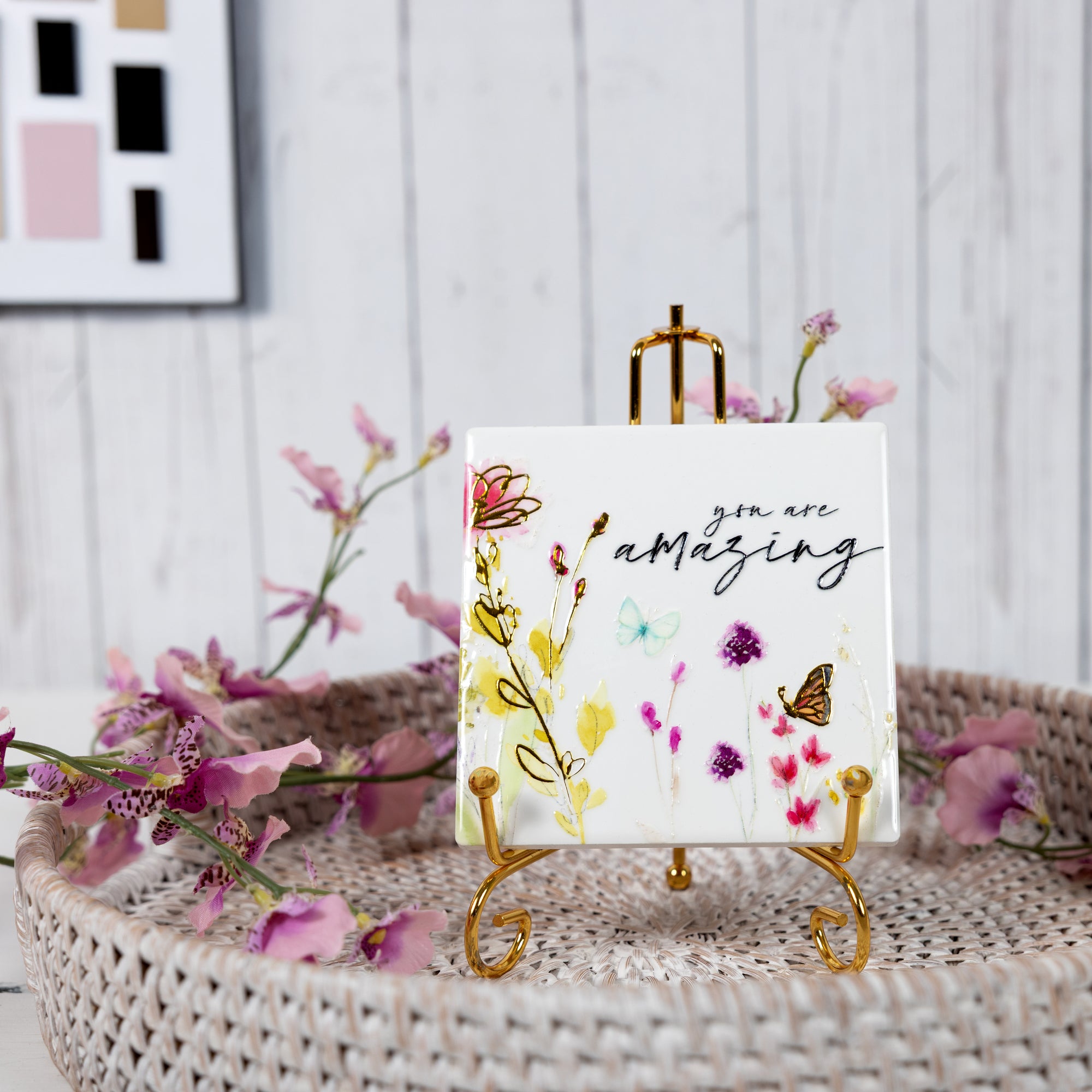 - PREMIUM QUALITY: Crafted from ceramic with a glossy finish, this 4" x 4" coaster features vibrant floral art, butterflies, and gold-embossed text reading “You are amazing.” The cork backing provides non-slip support and protects surfaces. The design combines artful color and gentle inspiration for everyday encouragement.