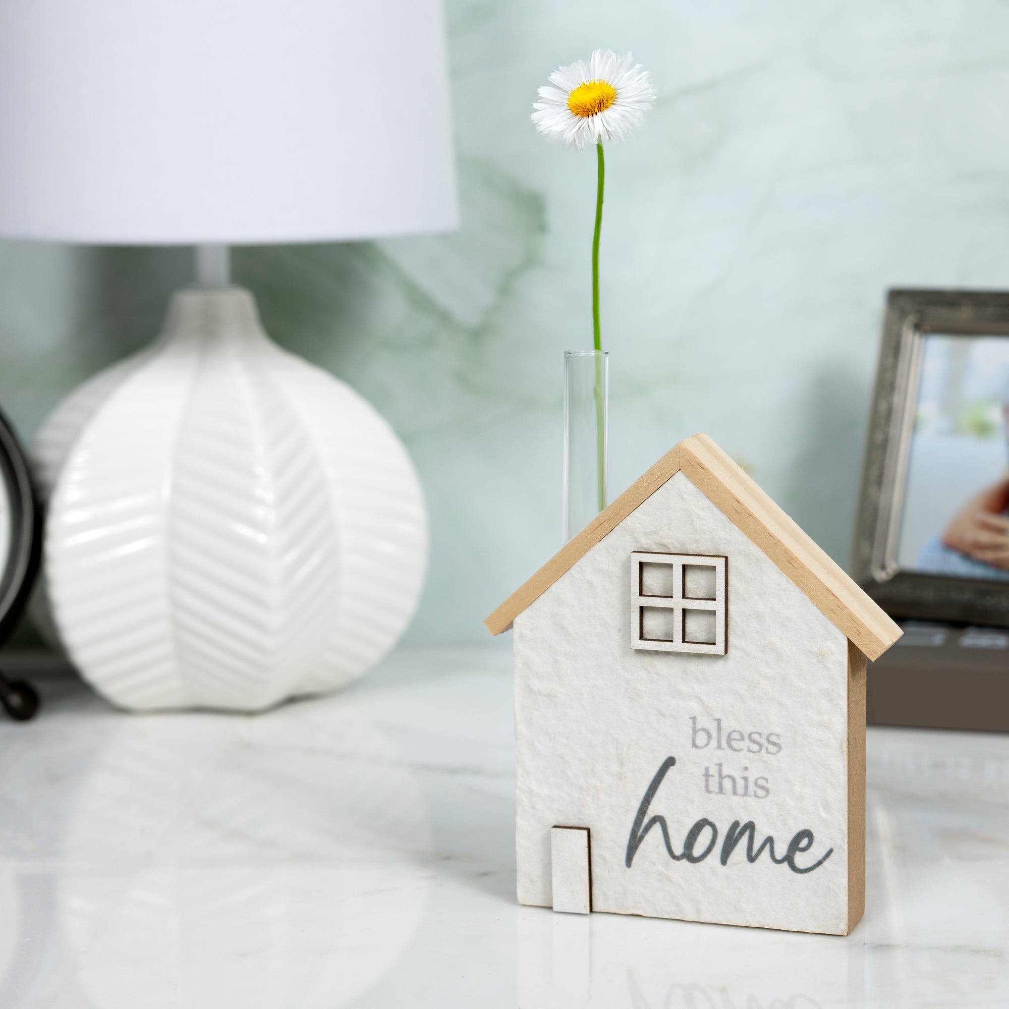- PREMIUM QUALITY: Made from durable pinewood and MDF, this 5" house-shaped plaque features a minimalist white facade with printed text and cutout window accents. Includes a removable glass tube vase for holding faux or fresh greenery.