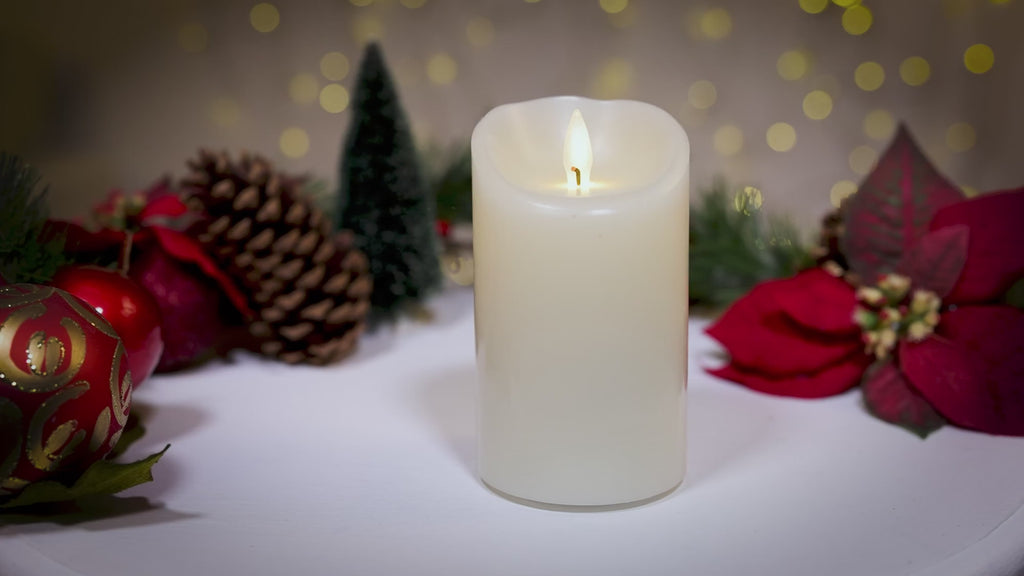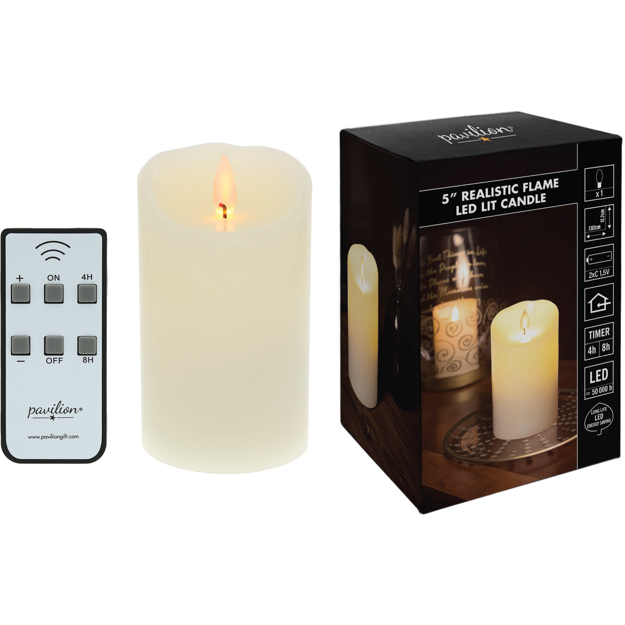 - PREMIUM QUALITY: This 5" tall, 3" diameter LED realistic single-flame and genuine paraffin wax candle encases the plastic component, including an on, off, and 5-hour timed setting with a 19-hour off setting that cycles through 24 hours. 2 AA Alkaline batteries are required but not included. The remote, including a CR 2025 battery, is made from plastic with soft silicone buttons with 4-hour, 8-hour, on, off, and +- brightness settings. The LED component lasts nearly 50,000 hours.