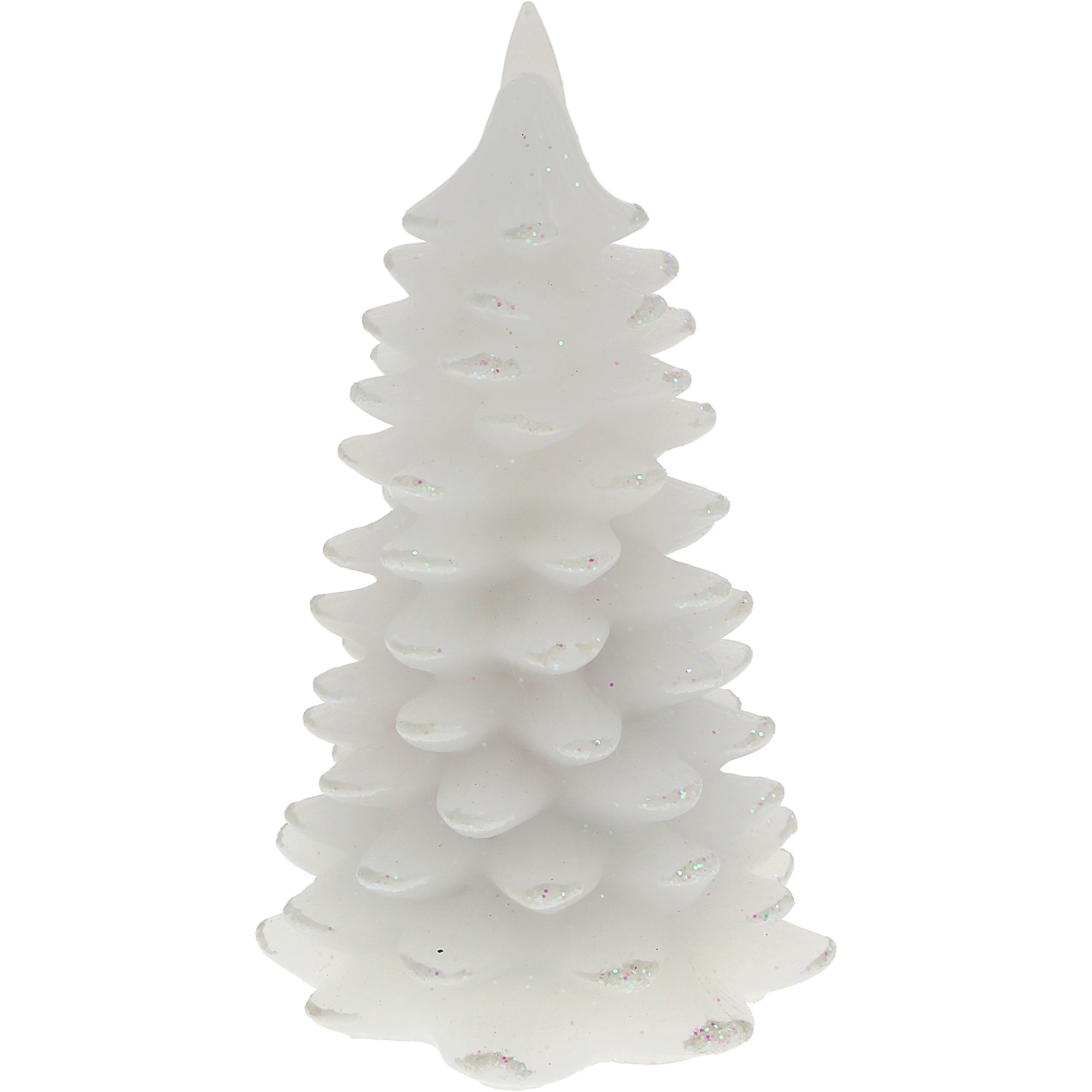 - IN-HOUSE DESIGN: The white wax pine tree has frosted white snow tips and an added sparkling glitter touch. The waving flame imitates a real candle without the risks of open fire that can be hazardous to densely decorated areas.