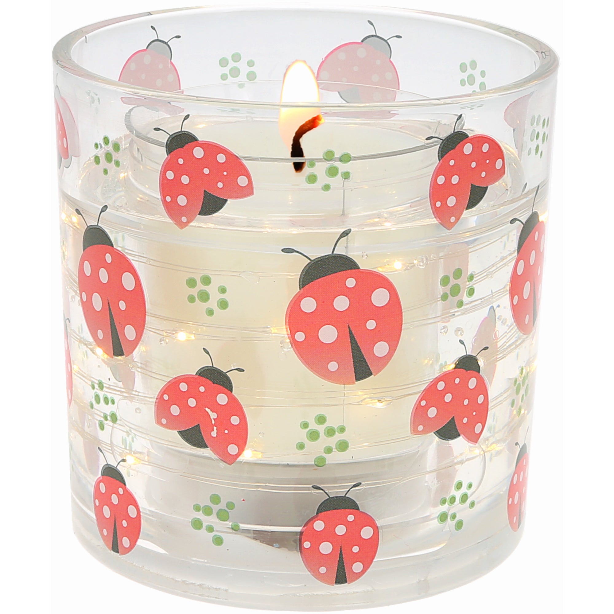 - PREMIUM QUALITY: This 3.5 oz glass candle features unscented 100% soy wax surrounded by heat-activated LED lights suspended in clear gel. As the candle warms, the LEDs create a soft, comforting glow without added fragrance. Durable printed glass artwork includes vibrant ladybugs and greenery. Packaged with a printed band and plain acetate cover inside a protective white die-cut box.