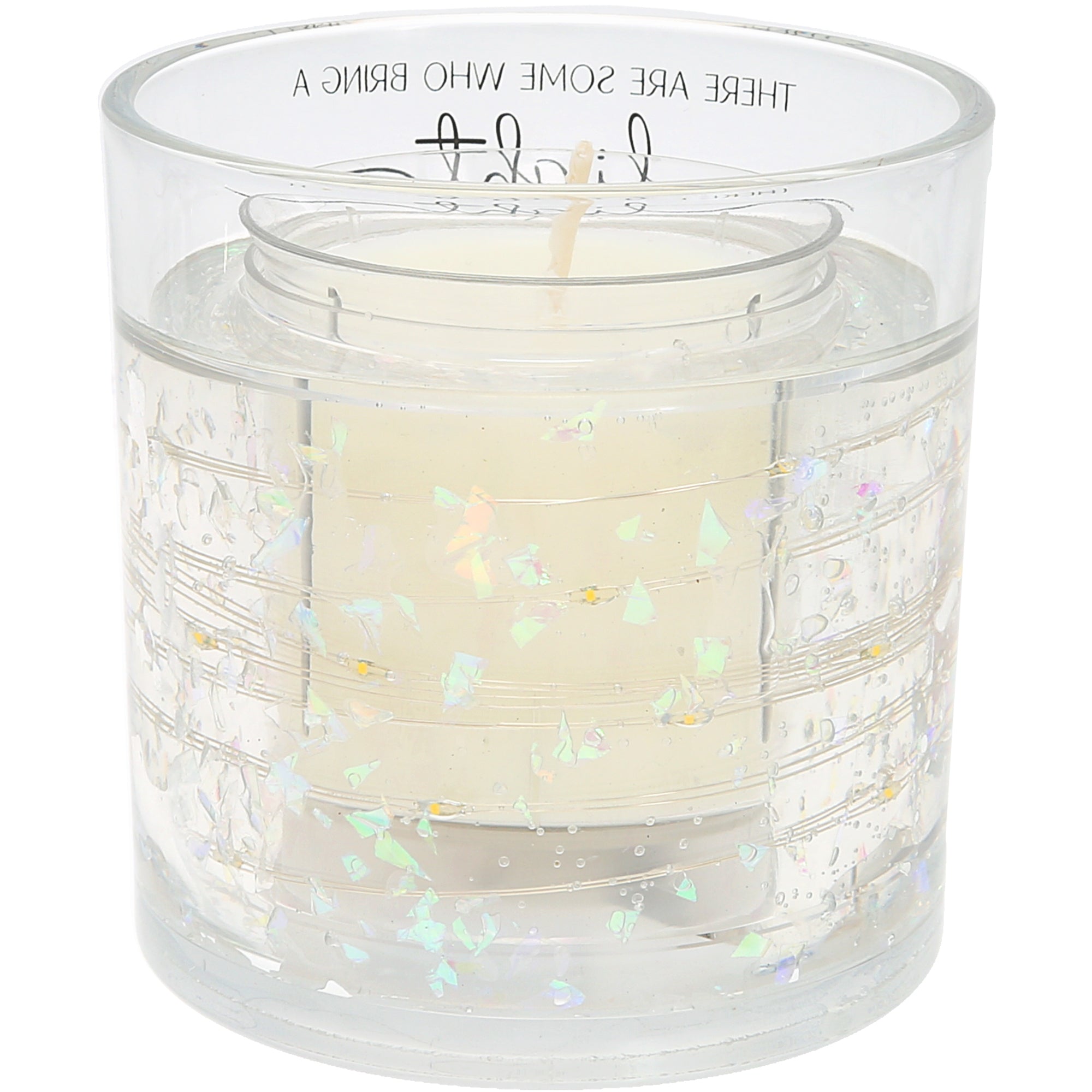 - PREMIUM QUALITY: This 3.5 oz glass candle is filled with unscented 100% soy wax and features embedded LED lights suspended in clear gel. When the candle warms, the LEDs glow softly to enhance the flame, creating a comforting luminous effect. Designed with a printed band and high-clarity glass for a polished, gift-worthy finish. Includes a white die-cut box for safe gifting.