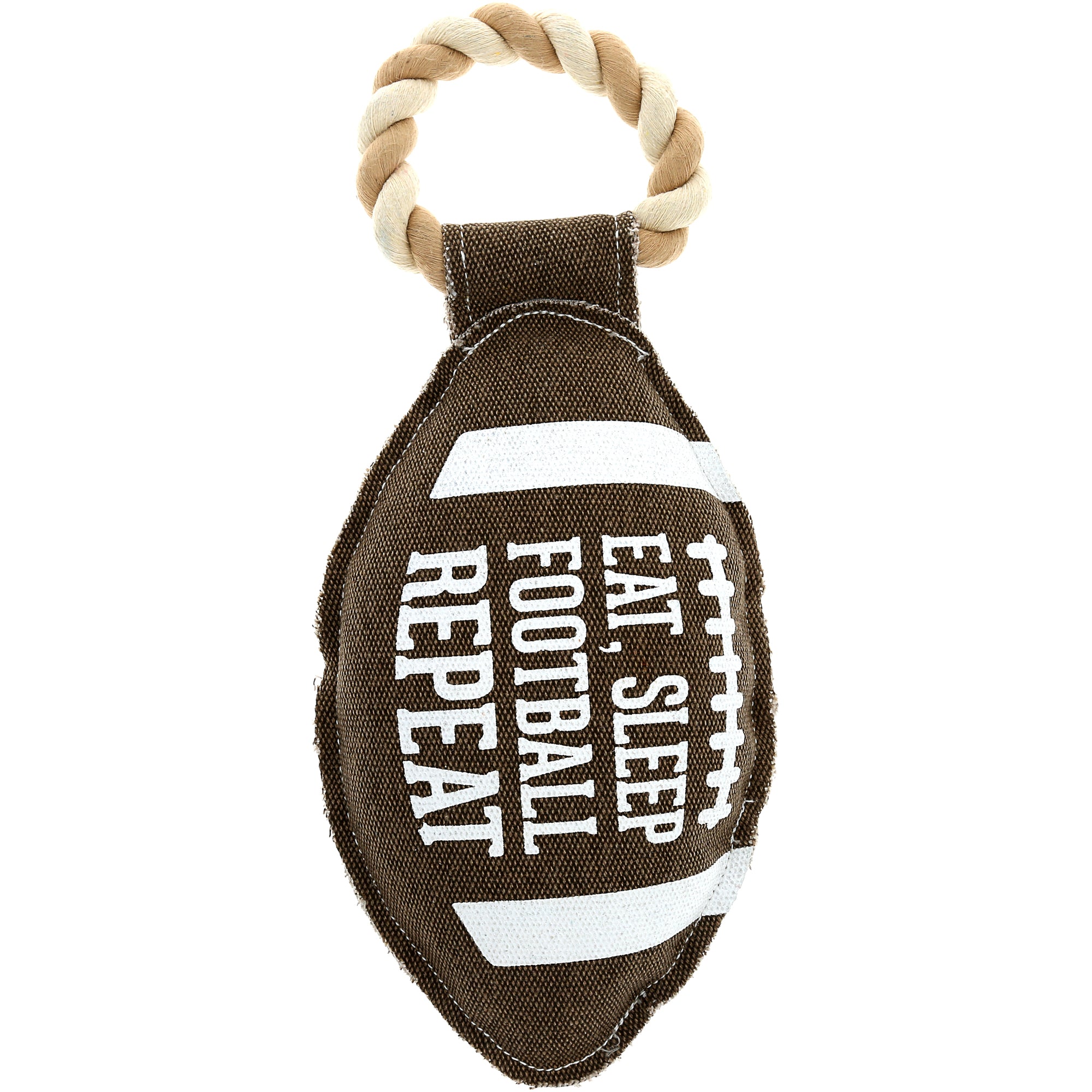 • IN-HOUSE DESIGN: Designed in the shape of a classic brown football, this toy features screen-printed "Eat, Sleep, Football, Repeat" text, making it a perfect choice for sports-loving pet parents. Reinforced stitching enhances durability for rough play.