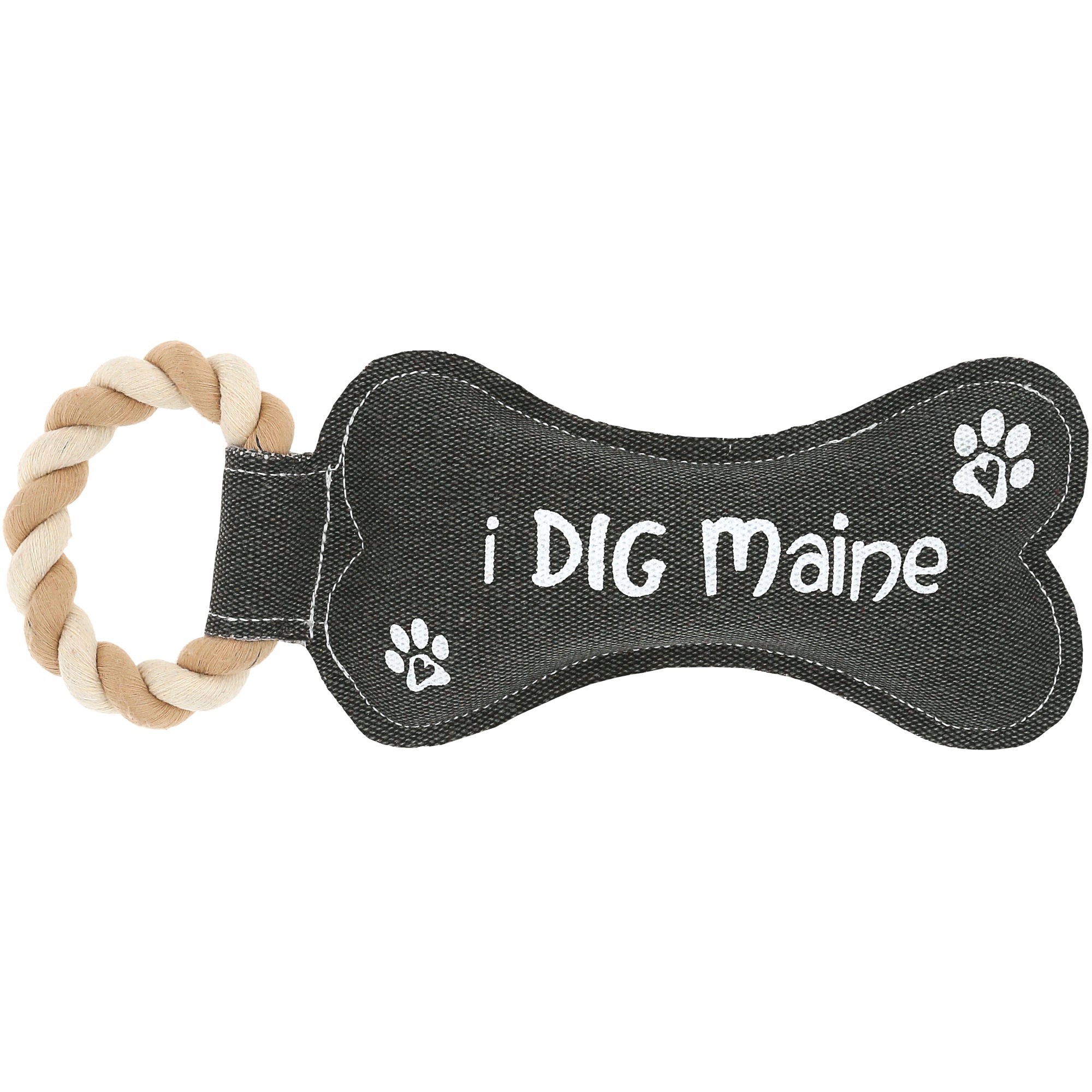 - IN-HOUSE DESIGN: Features a classic black canvas background with “I Dig Maine” printed in white text and accented paw prints. The rope loop adds texture and coastal charm for easy carrying or tugging.