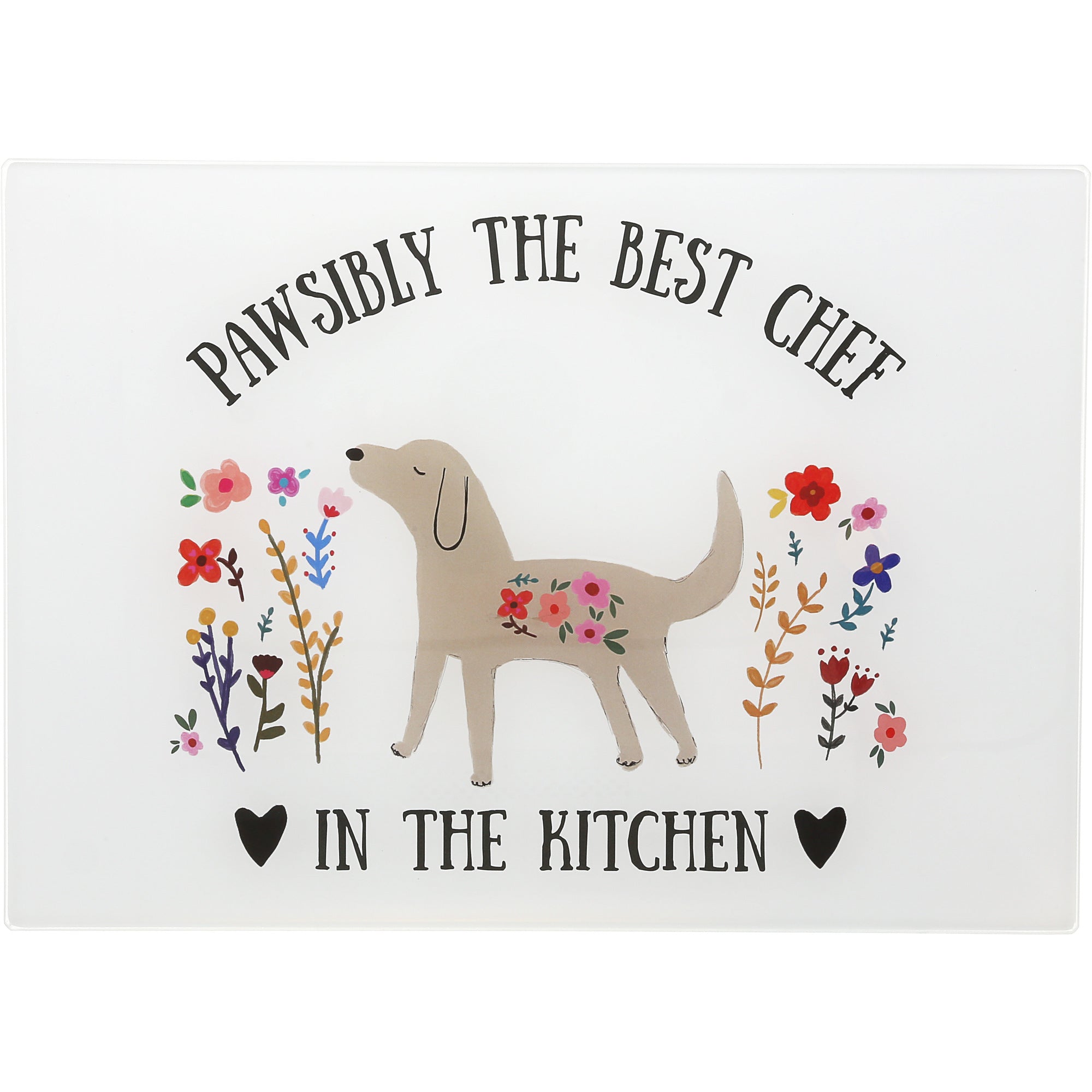 - IN-HOUSE DESIGN: Showcases a light brown dog decorated with floral accents, standing proudly in a whimsical garden setting. The phrase “Pawsibly the Best Chef in the Kitchen” is printed in bold, playful lettering above and below the illustration. A sweet and pun-filled nod to dog lovers who rule the kitchen.