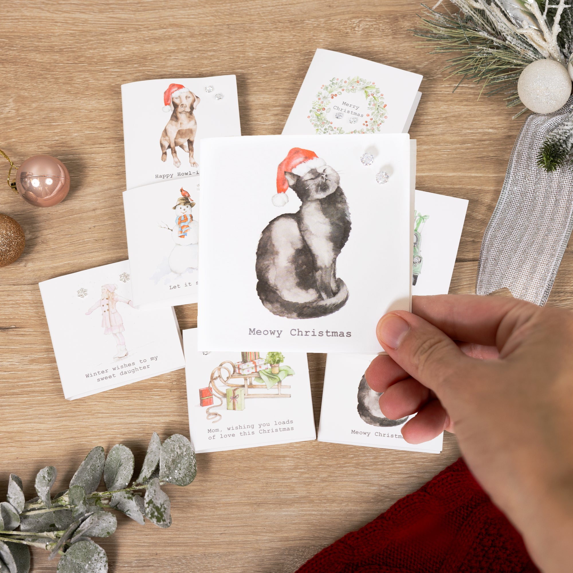 - IN-HOUSE DESIGN: The black and gray cat with a red Santa hat offers a winter wonderland feel. Below it is the gray, typewritten "Meowy Christmas" sentiment, whereas the earring is placed in the upper right.
