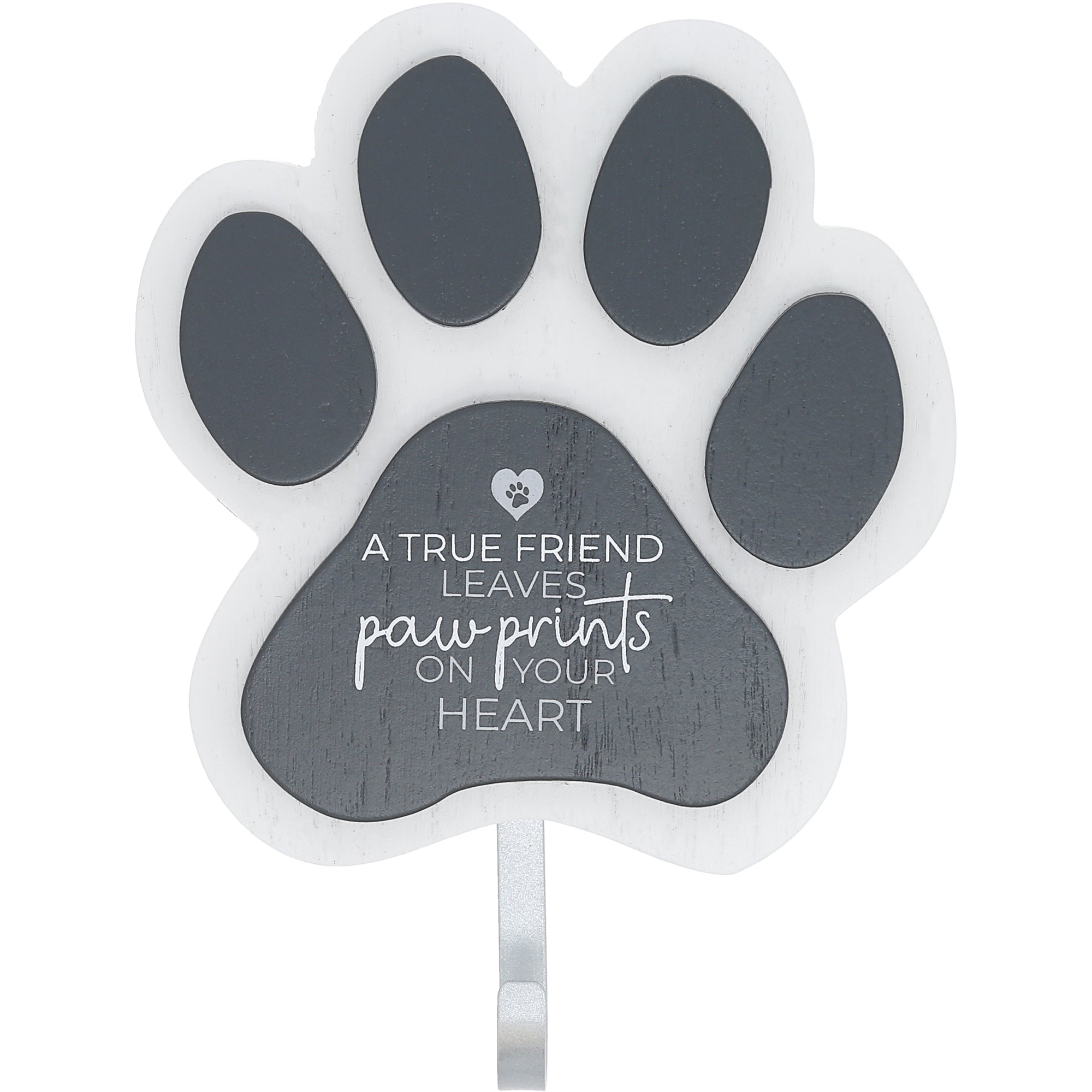 - IN-HOUSE DESIGN: The white finish has a raised gray 3D dog pawprint. The large pad has a white sentiment, "A True Friend Leaves Paw Prints On Your Heart," accompanied by a heart shape and a pawprint in the middle. Hang it next to the door to hold your dog's leashes, harnesses, waste bags, and collars, making them easy to find each time you get ready to go out together.