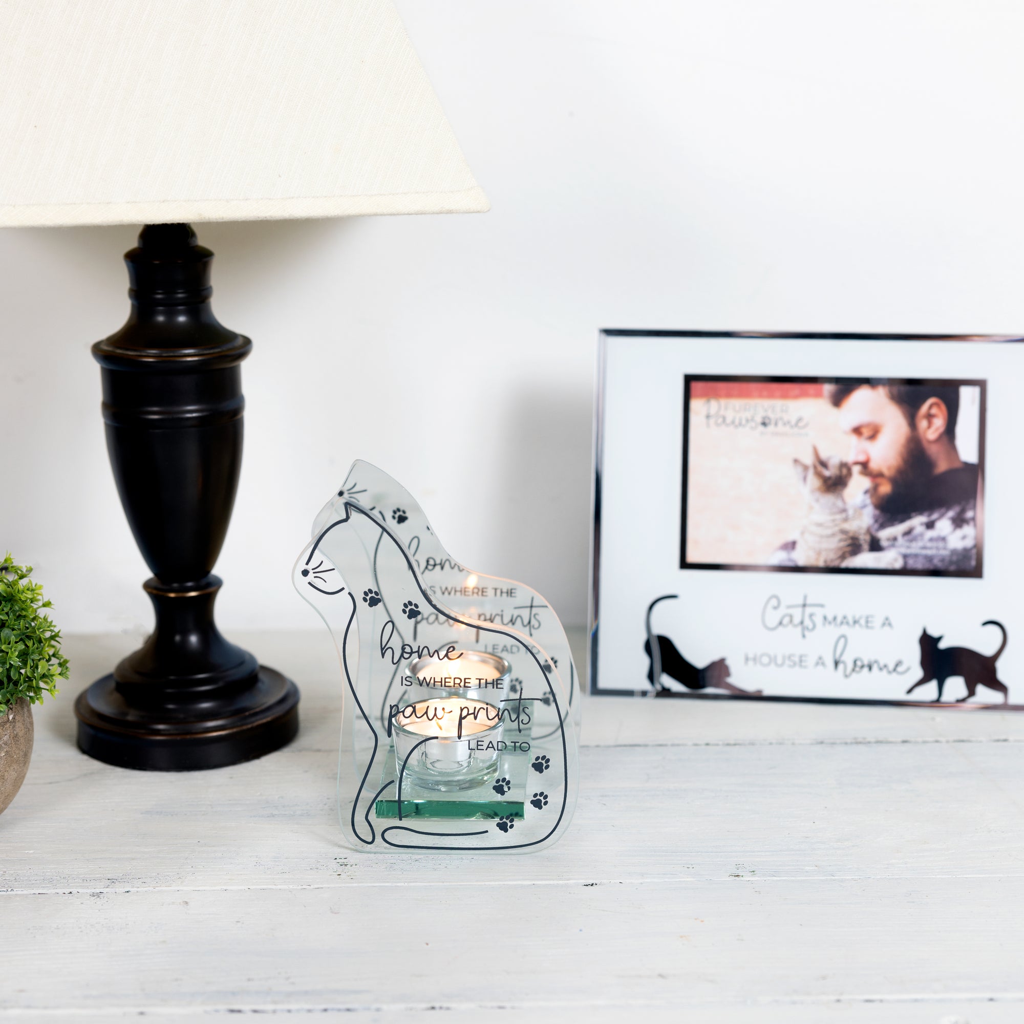 - IN-HOUSE DESIGN: "Home Is Where The Paw Prints Lead To" is printed in dark gray and accompanied by a kitty paw, tail, whiskers, ear & nose silhouetted line, and paw print design on the front glass piece.