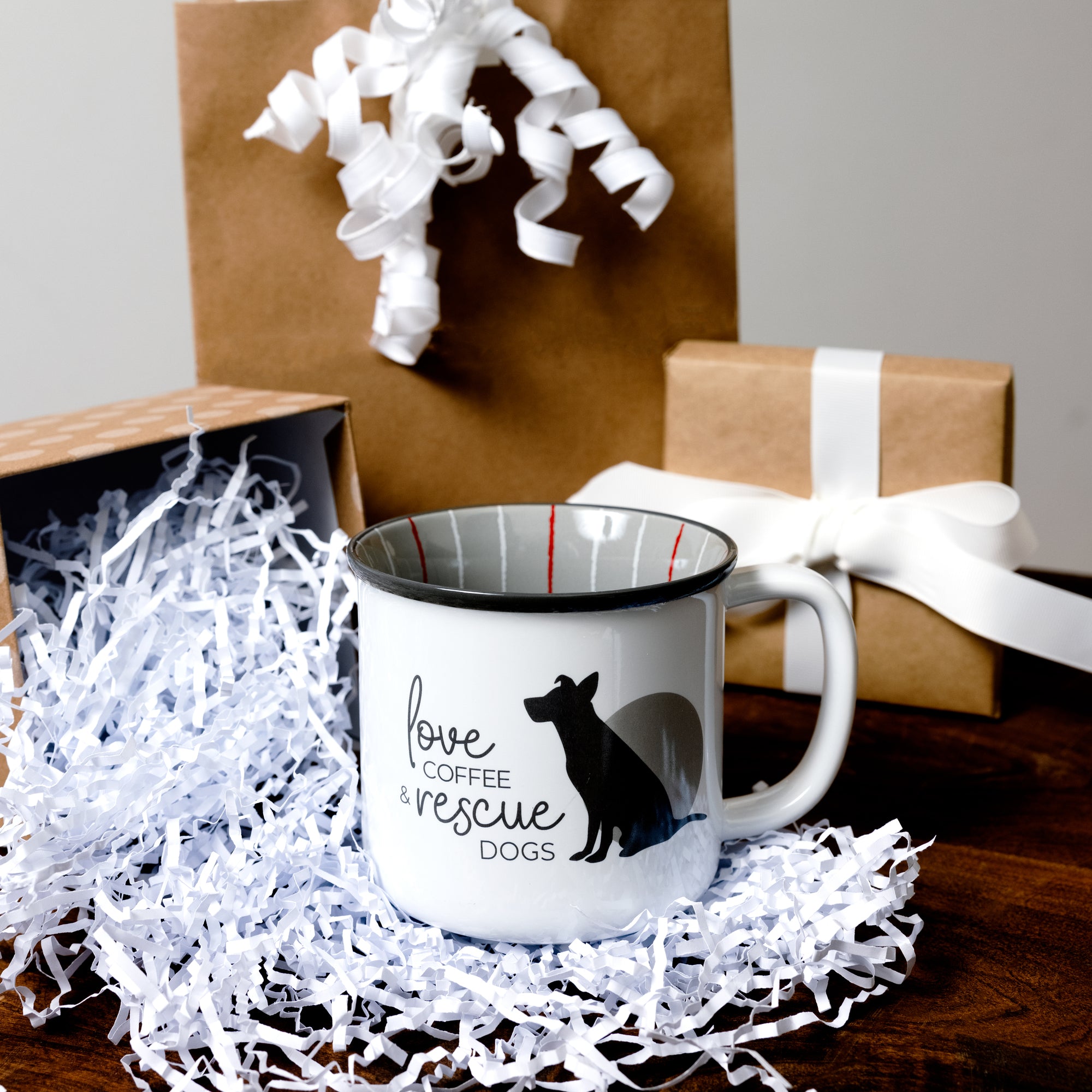 • IN-HOUSE DESIGN: The mug's front features a dog silhouette with a circle behind the dog. To the left is a sentiment: "I Love Coffee & Rescue Dogs." The lip of the white cup is dark gray, whereas the gray interior has a crayon-looking white and red striped pattern interior wrap-around finish.