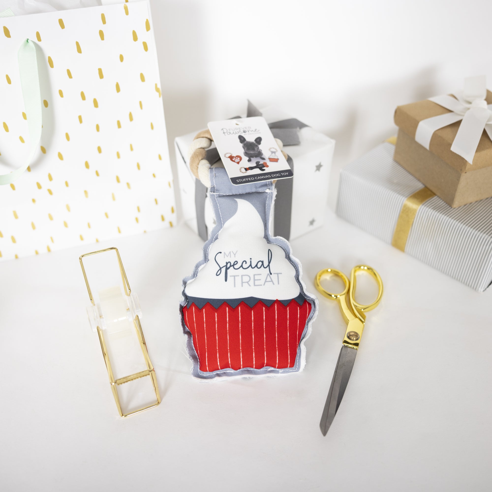 - PREMIUM QUALITY: This 10" tall, 5" long & 2" wide dog toy is made from durable materials—a gray background with a red wrapper, vanilla frosting canvas-woven body that combines polyester and natural cotton. The edges of the cupcake have a weathered rustic look. The fluffed-up polyester fiber-filled center with white stitching shapes contains a single plastic squeaker while attaching the secured top rope. The backside includes a branded tag.