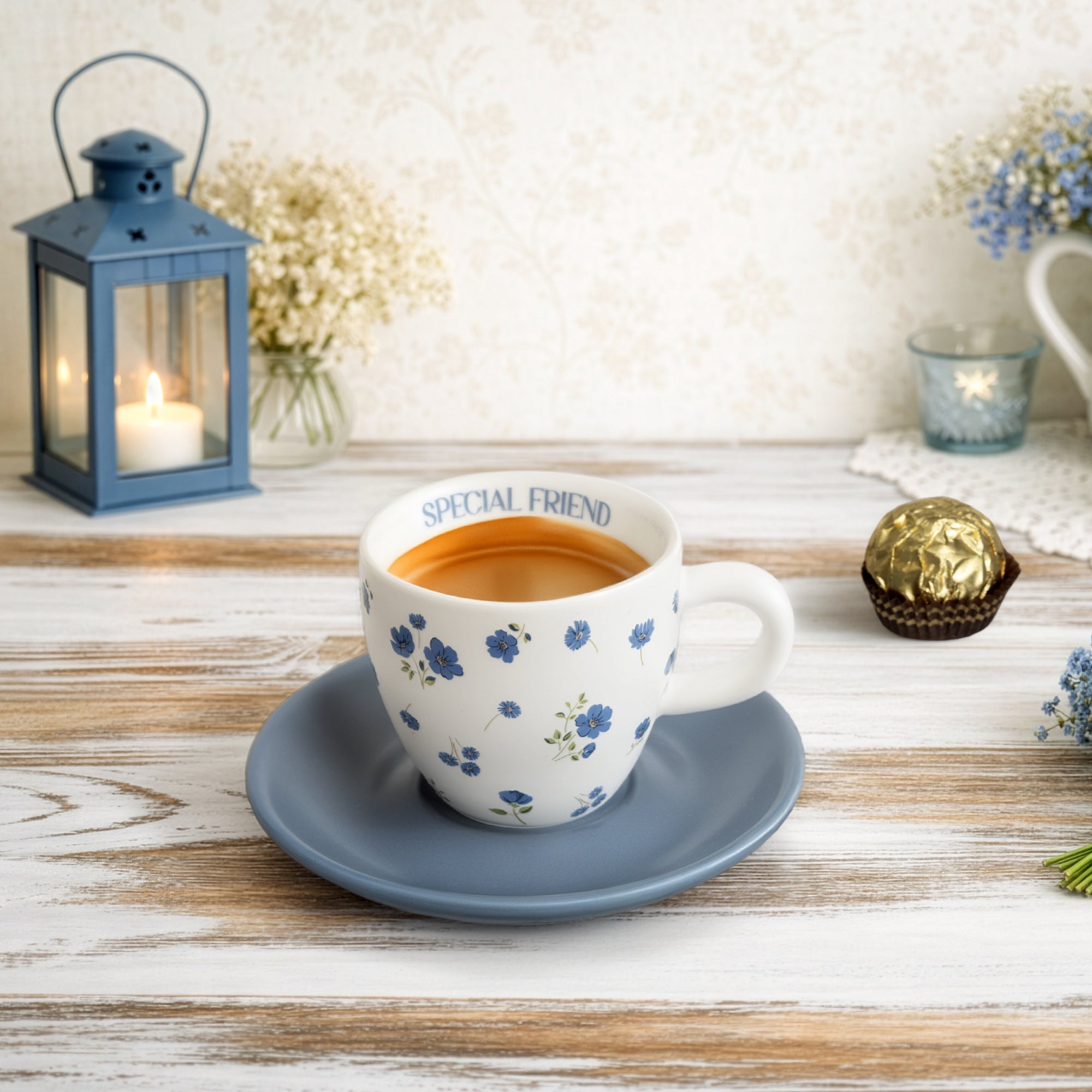 - IN-HOUSE DESIGN: Decorated with blue floral artwork and an embossed “Special Friend” sentiment. The deep blue saucer complements the floral pattern, giving it a warm and meaningful gifting appeal.