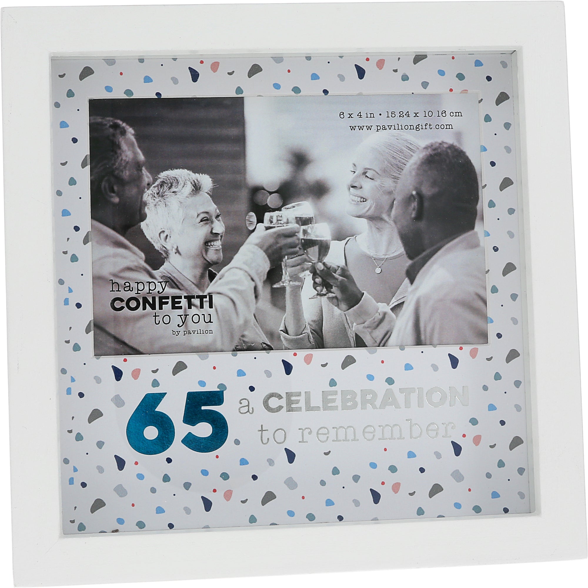 - IN-HOUSE DESIGN: The glass front features the electroplated silver sentiment "65 A Celebration To Remember." The mat board is adorned with a speckled pebble blue, pink, and gray pattern. The backing includes thick cardboard-like material with a metal hinged easel and triangle hanger for versatile display options, as well as two metal tabs for easy photo replacement.