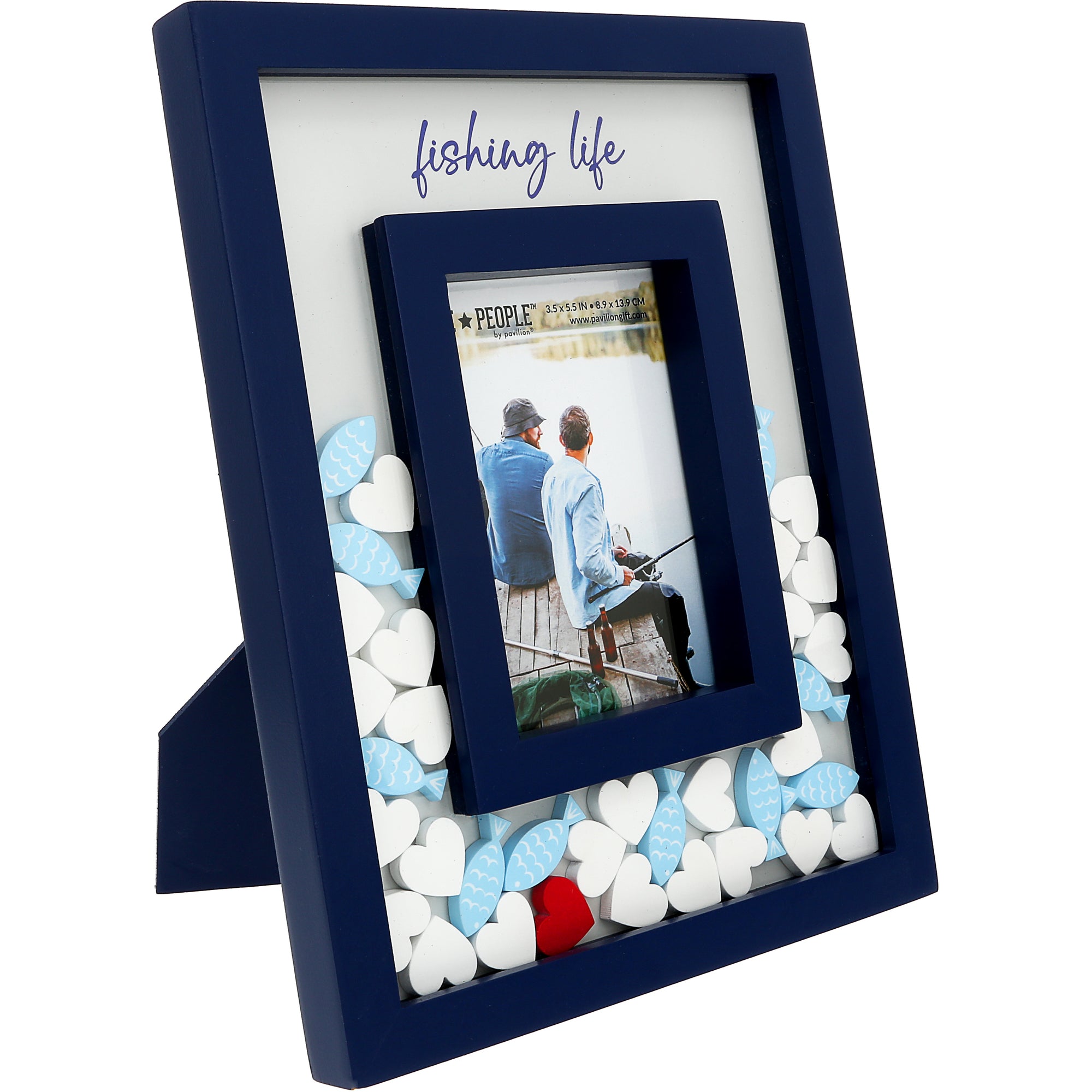 - IN-HOUSE DESIGN: Featuring a deep navy blue border, this frame embodies the spirit of fishing culture. The scripted “Fishing Life” phrase adds a personalized touch, while the floating fishing lures and hearts celebrate the thrill of the catch and the peace of the water. Whether displayed in a lake house, fishing cabin, or home office, this frame is a wonderful way to showcase your greatest fishing moments.
