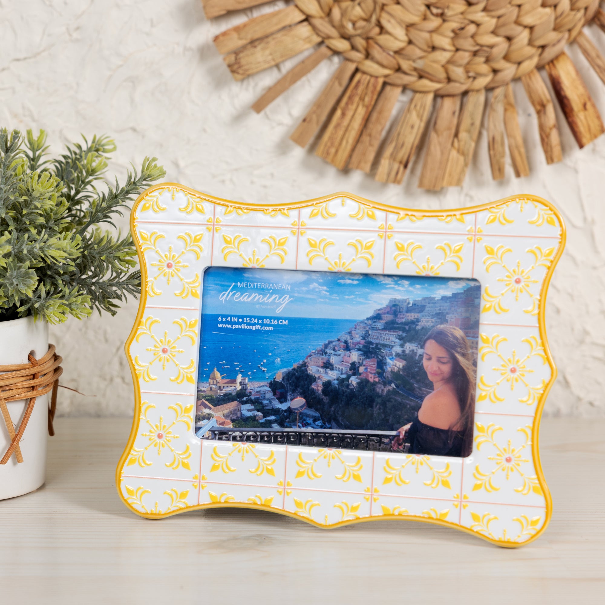 - IN-HOUSE DESIGN: This frame showcases a vibrant yellow Mediterranean-inspired pattern, enhanced with intricate 3D embossed decal artwork that adds depth and elegance. The rich yellow design, inspired by sunlit coastal landscapes and Mediterranean tilework, brings a warm, cheerful aesthetic to any room. This eye-catching pattern transforms the frame into a decorative piece, making it more than just a photo display but a beautiful accent to your home decor.