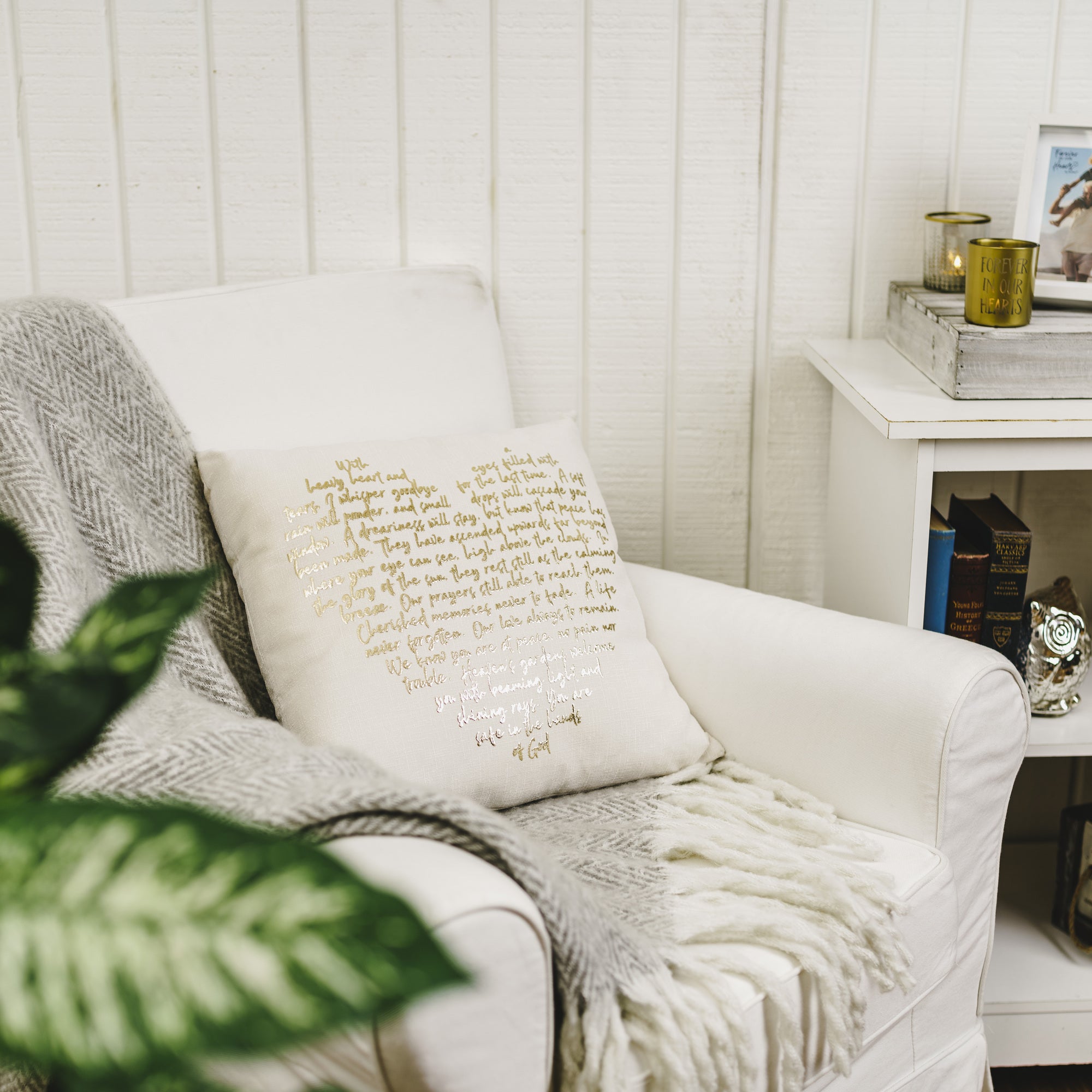 • IN-HOUSE DESIGN: In God's Hands poem text is applied to the front of the pillow.