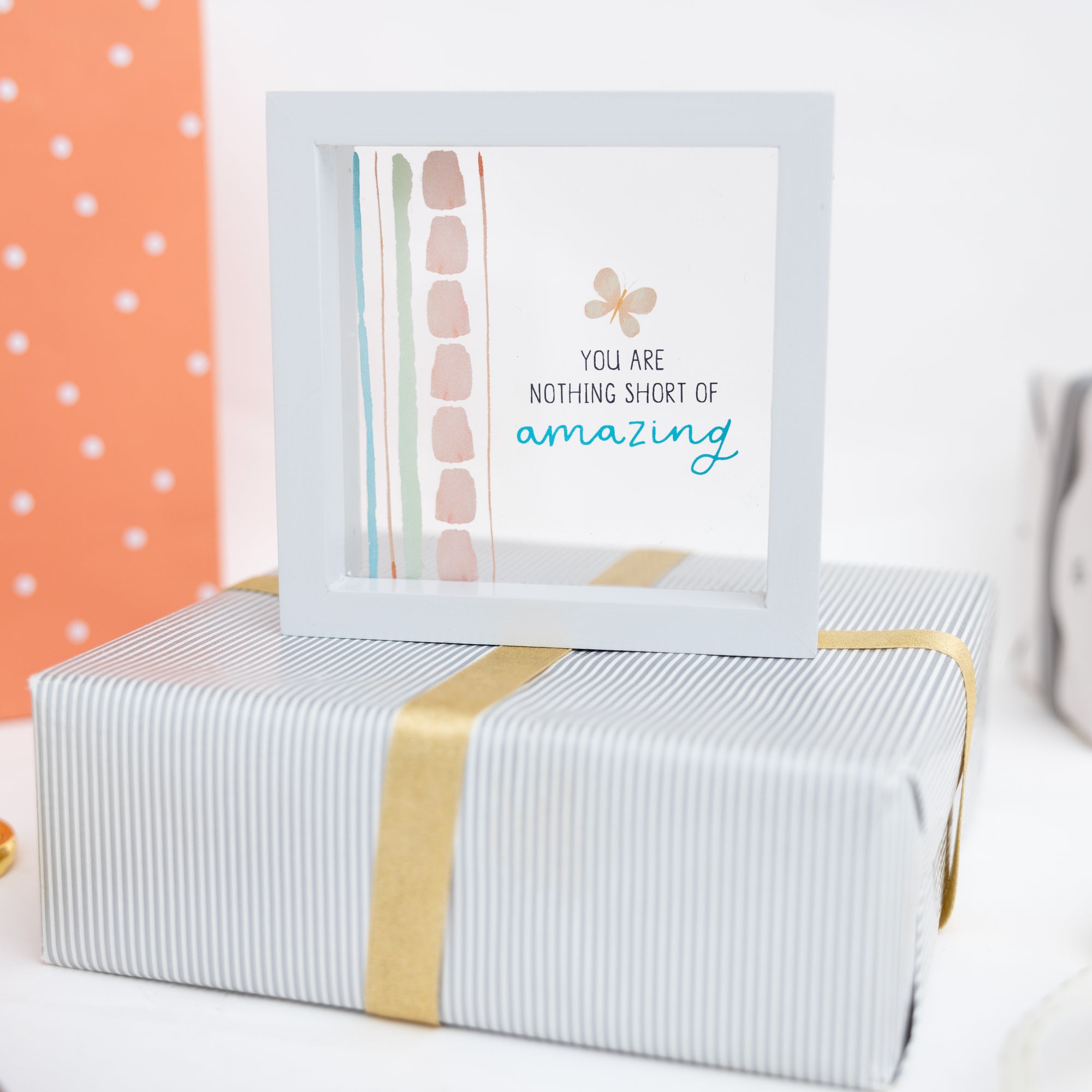 - IN-HOUSE DESIGN: Blue, green, and pink watercolor paint-inspired stripes and an orange butterfly are accompanied by a "You Are Nothing Short Of Amazing" sentiment-printed decal on the front side of the see-through glass. The artwork was designed by Blue Chair Blessing, who sees beauty in everyday life.