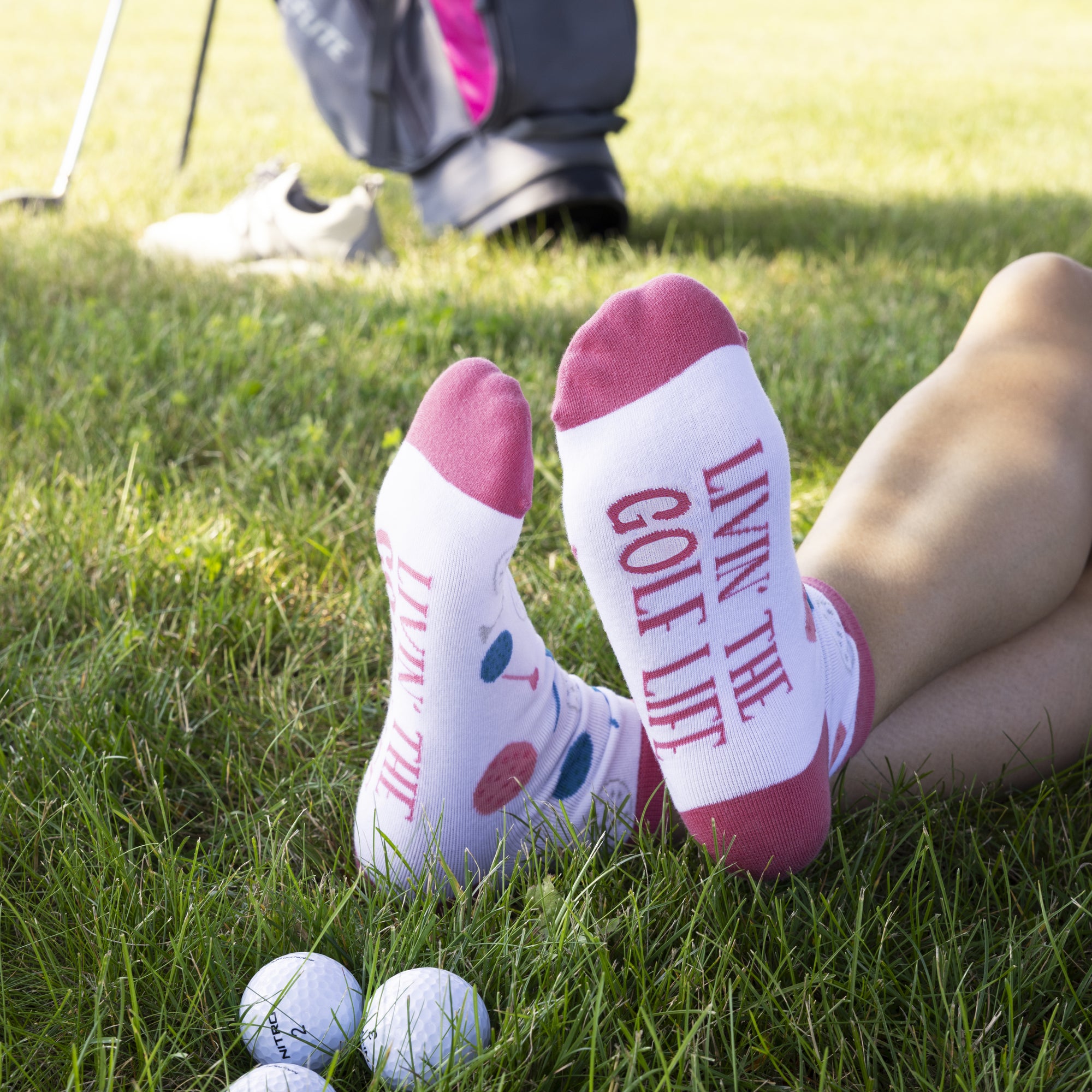 • IN-HOUSE DESIGN: The socks in this set feature a playful design with pink ankle, heel, and toe accents. The overall pattern showcases pink, blue, and gray golf balls along with gray tees, creating a fun and vibrant look. At the bottom of the socks, you'll find the sentiment "Livin' The Golf Life," adding a touch of golf-inspired charm to the design.