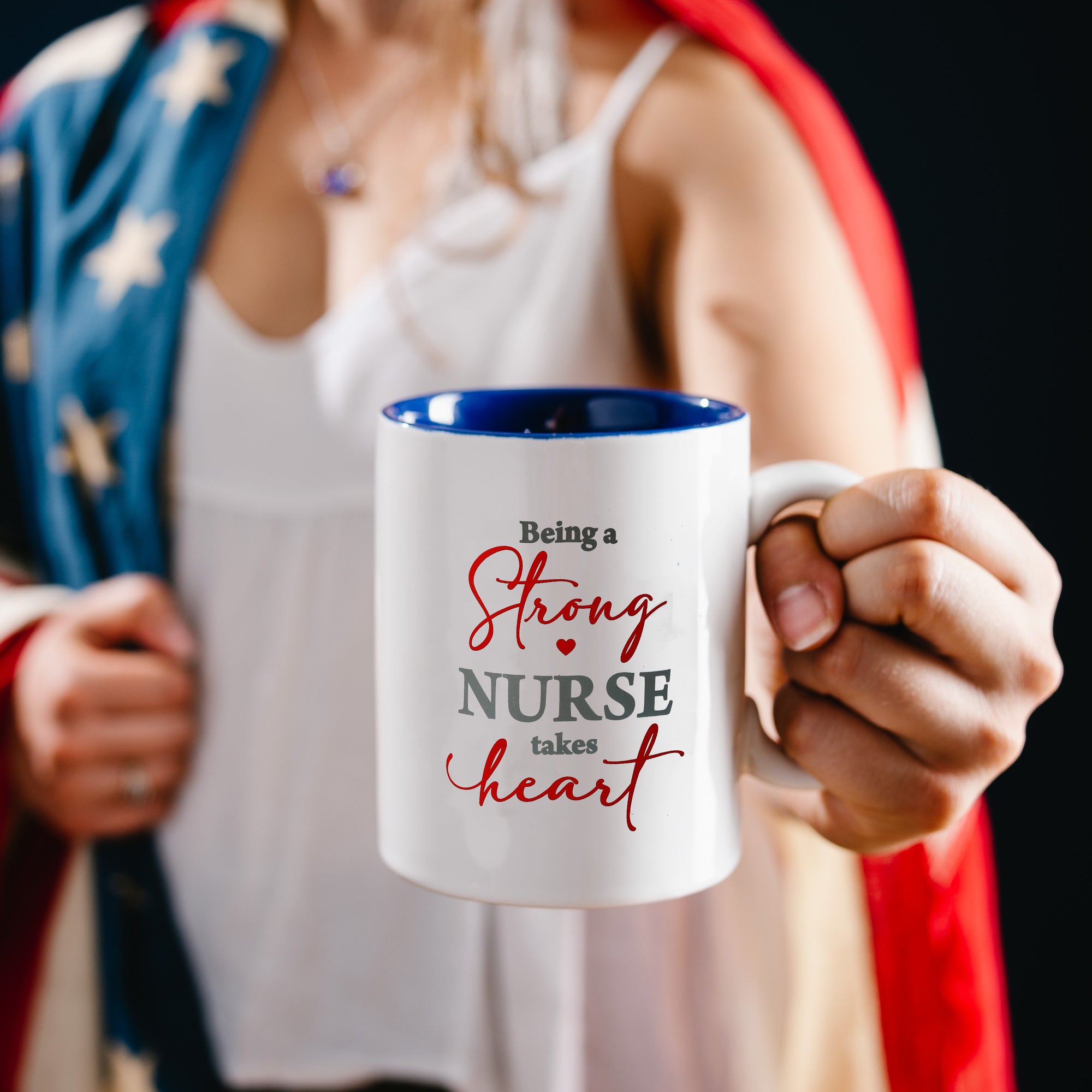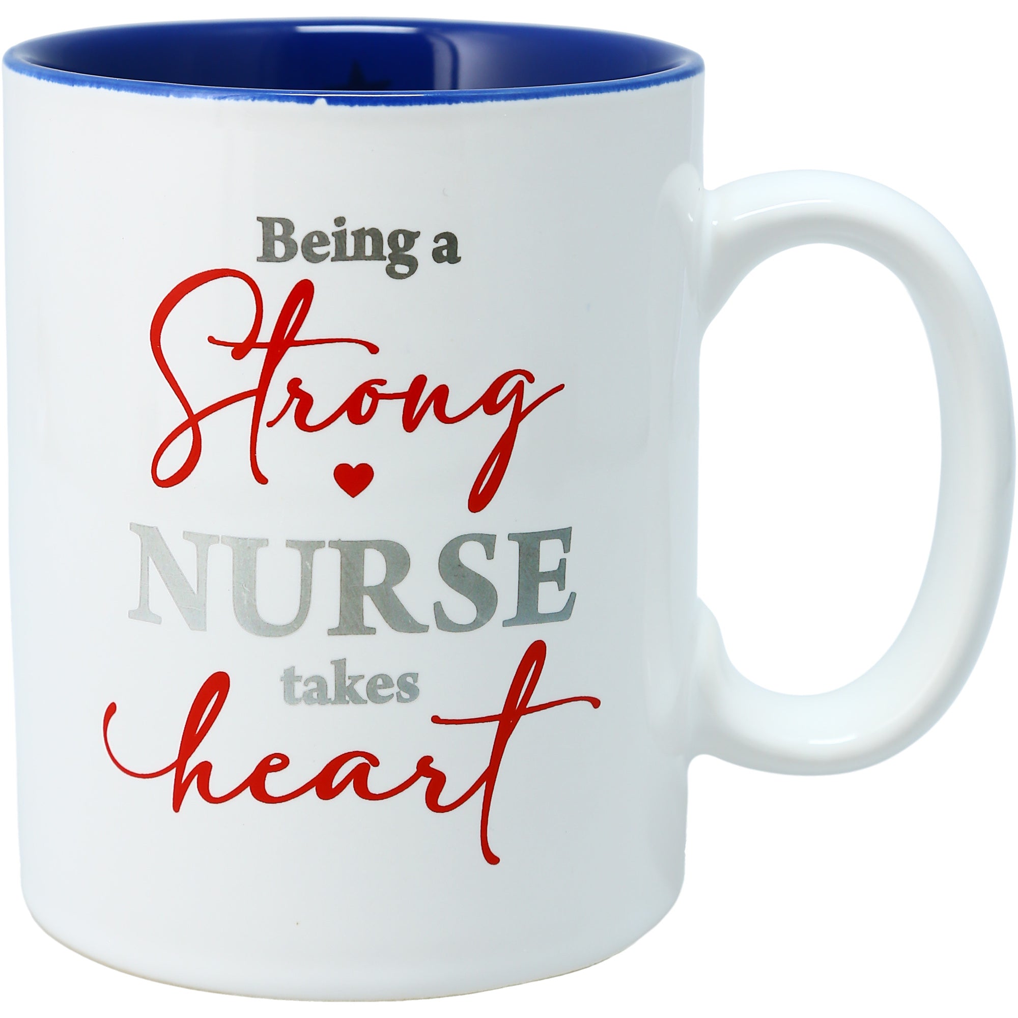 - IN-HOUSE DESIGN: "Being a Strong Nurse Takes Heart" is printed on the front of mug.