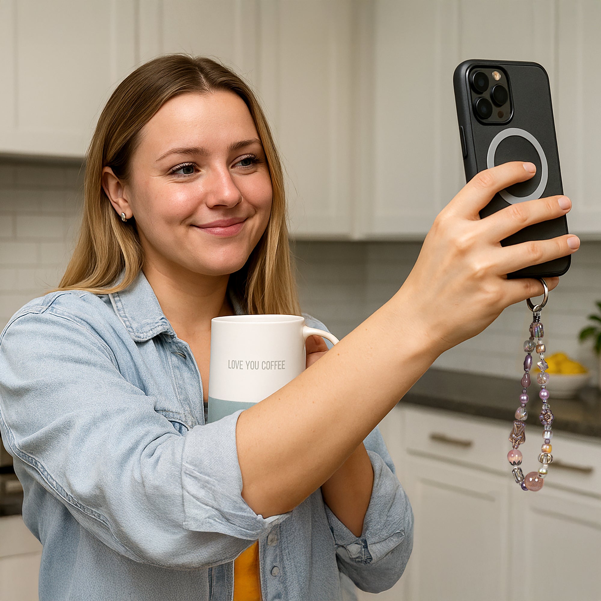 - PREMIUM QUALITY: This hands-free wrist strap is made from a high-strength elastic core and adorned with elegant, iridescent beading that gives it both durability and style. The construction allows for gentle stretch and flexibility without sacrificing reliability. The sturdy metal clasp is easy to clip onto the included clear acrylic phone tab, which slides securely between your phone and case without causing damage. Built to offer function and flair, this strap is ideal for daily use, travel, errands, and more.