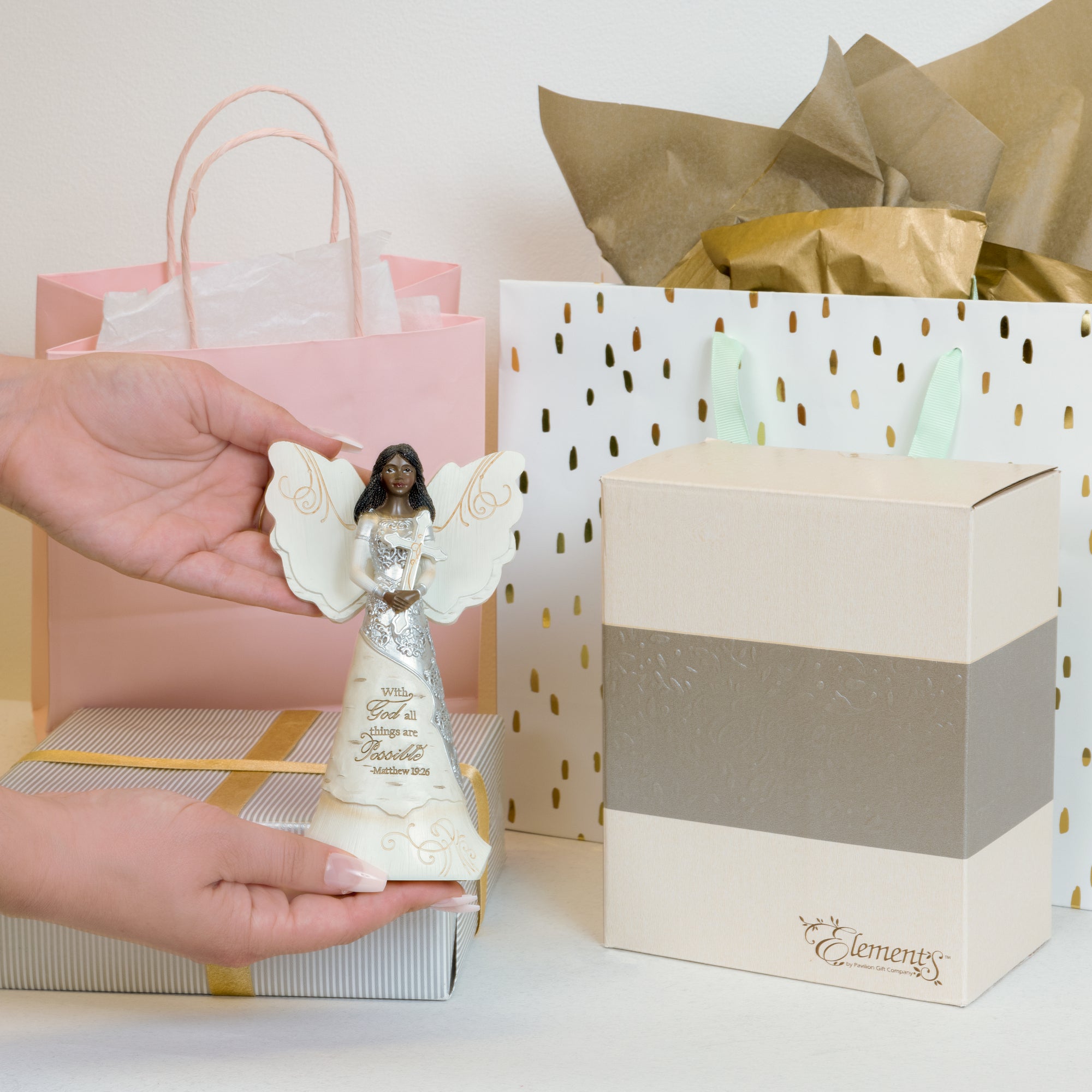 - IN-HOUSE DESIGN: "With God All Things Are Possible; Matthew 19:26" text is debossed and painted onto the front of the angel, alongside an intricate silver design and cross.