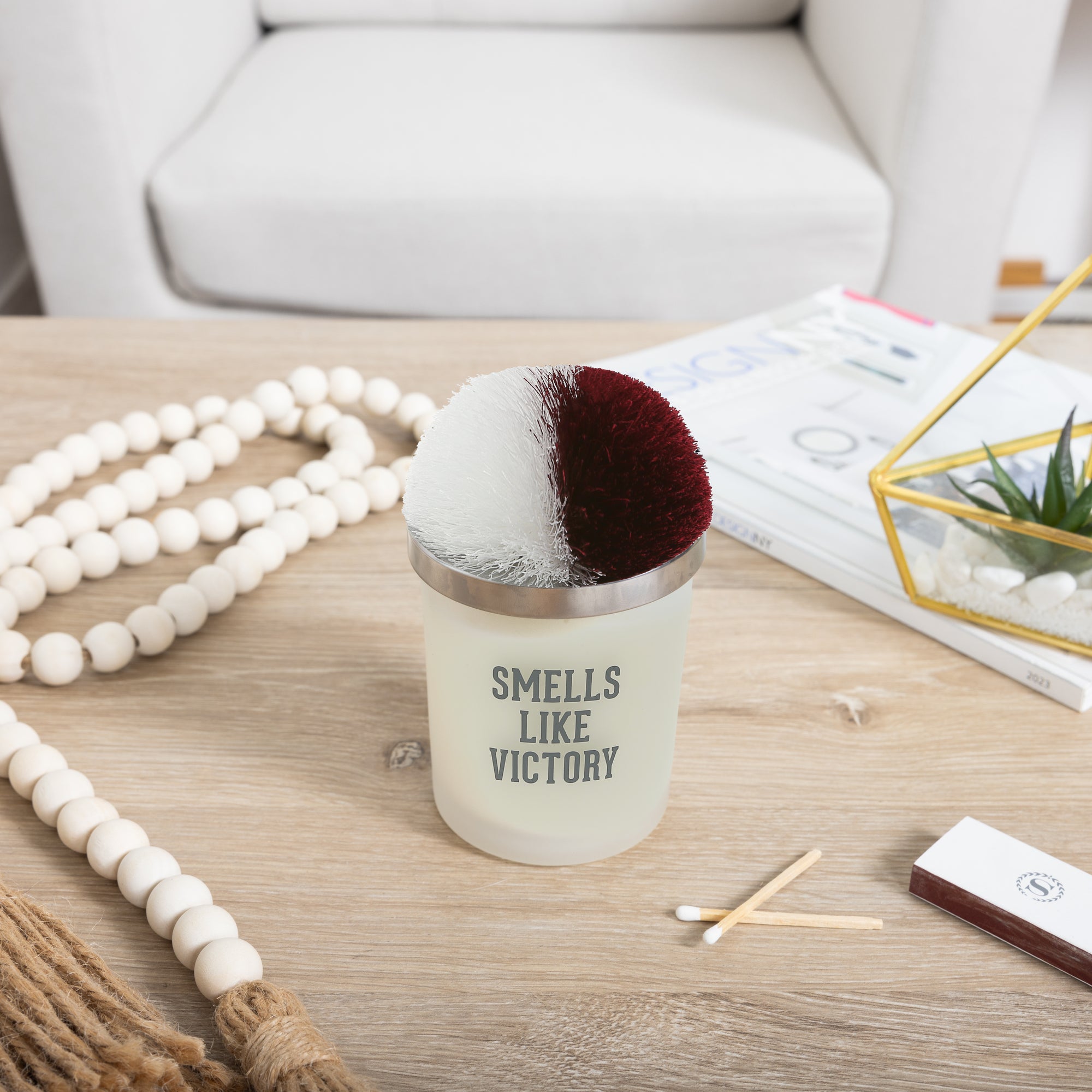 - IN-HOUSE DESIGN: The front side of the candle has a gray sport-style "Smells Like Victory" sentiment printed onto it. The maroon and white pom pom fills the lid's top - note colors can be mixed at the center. This simplistic-styled piece will fit into anyone's home during the sports seasons.