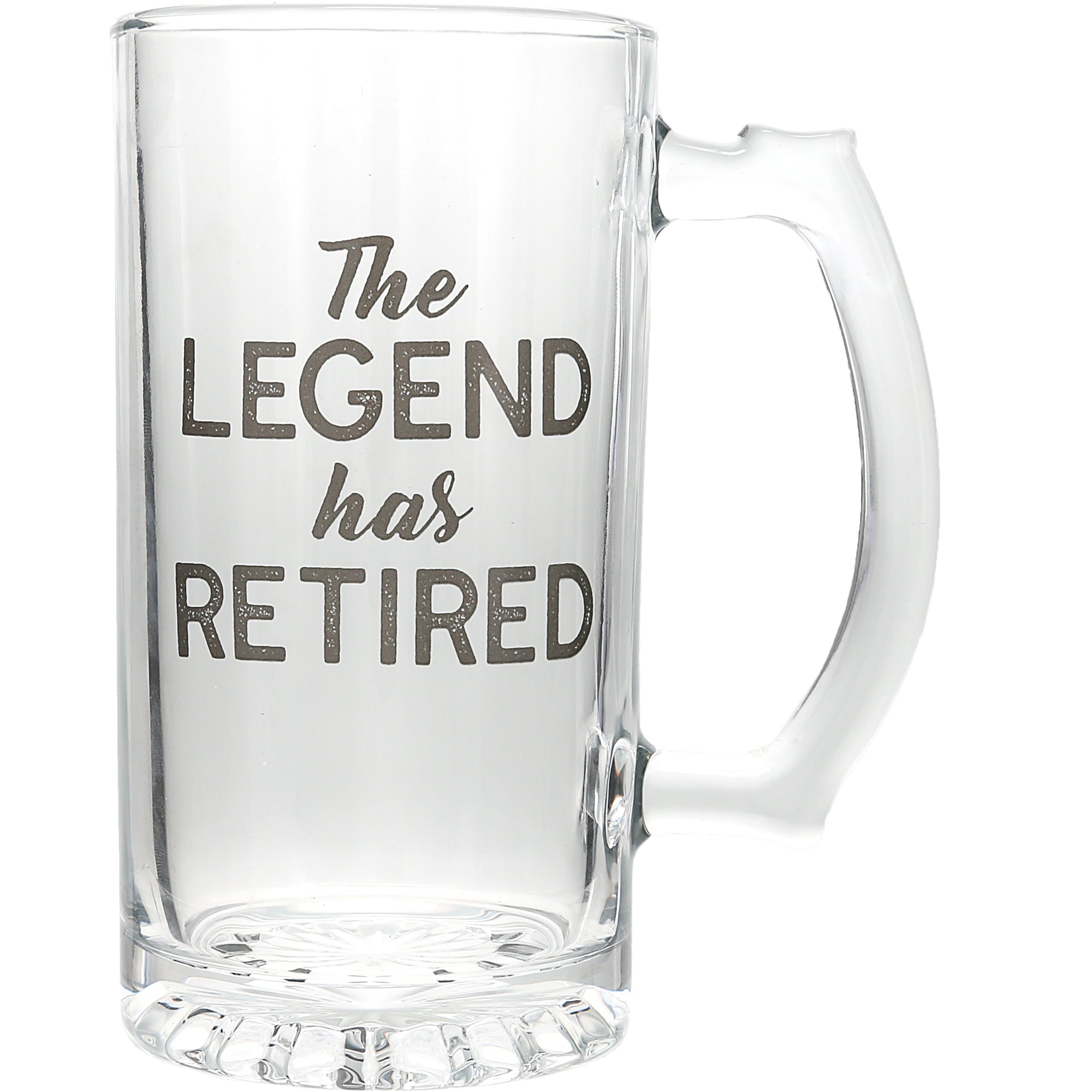 • PREMIUM QUALITY: This 16 oz glass beer stein is crafted from durable, clear glass with a solid base and wide handle for a comfortable, sturdy grip. Perfectly sized for beer, soda, or your favorite beverage, it’s both functional and stylish. The raised printed sentiment on the front adds texture and depth, while the weighted bottom provides stability. Each glass is securely packaged in a custom gift box featuring silver metallic heat-stamped details and the phrase “Cheers to a Legendary Retirement,” making it ready to gift straight from the shelf.