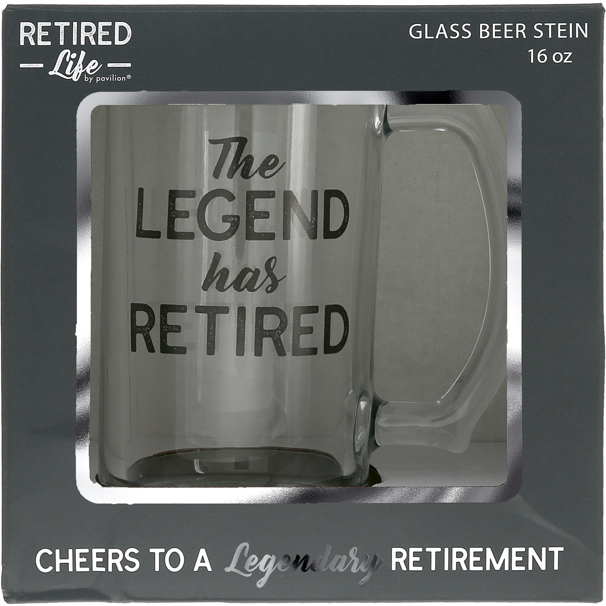 • IN-HOUSE DESIGN: Part of Pavilion’s Retired Life collection, this stein features bold black lettering that reads “The Legend Has Retired,” printed directly on glass for a clean, timeless look. The matching gift box design adds an elegant finishing touch with subtle metallic silver accents that shine under light—perfect for commemorating a lifetime of hard work and well-earned relaxation.