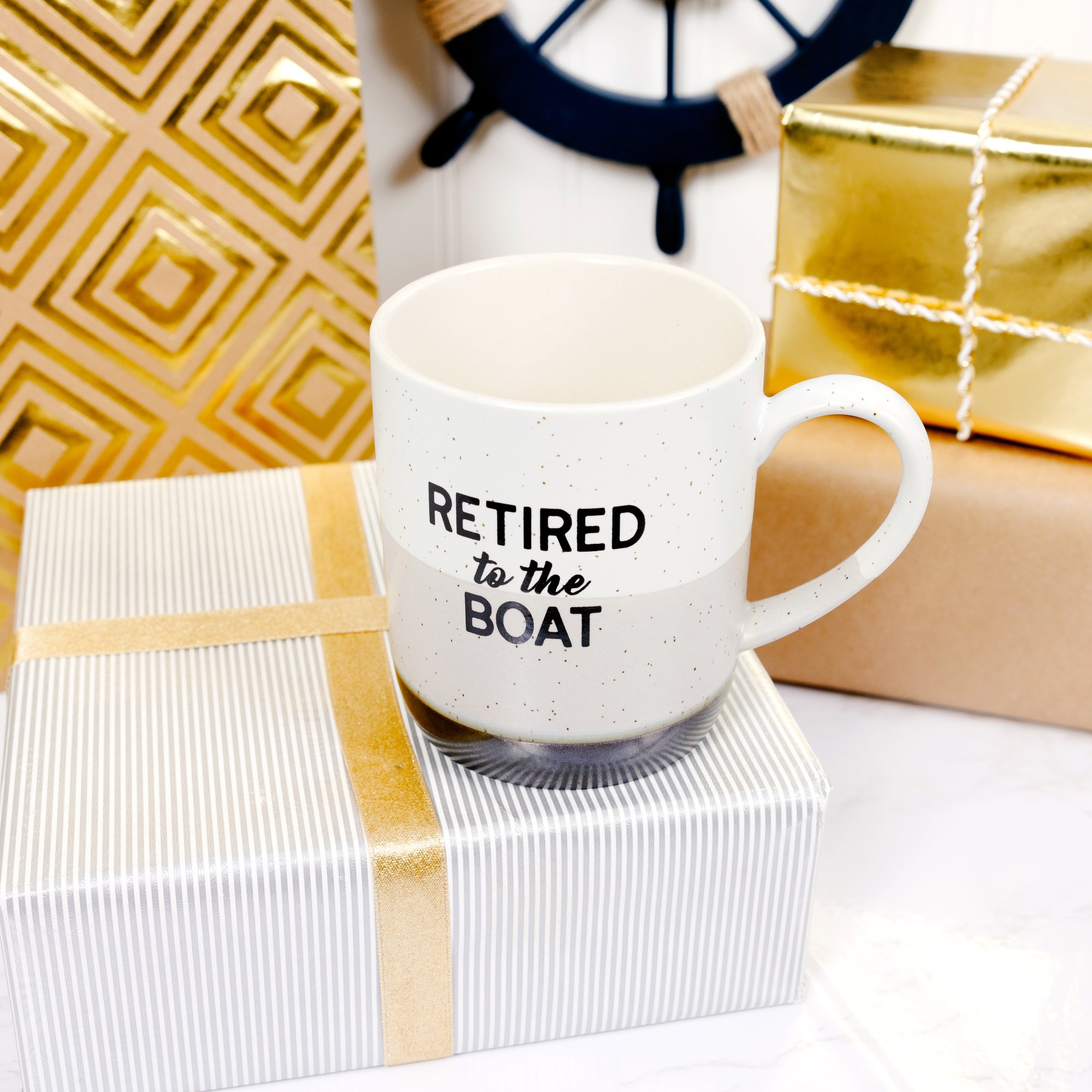 - IN-HOUSE DESIGN: The coffee cup features a simplistic speckled brown pattern (unique to each drinkware item) and a "Retired To The Boat" black sentiment in the front center.