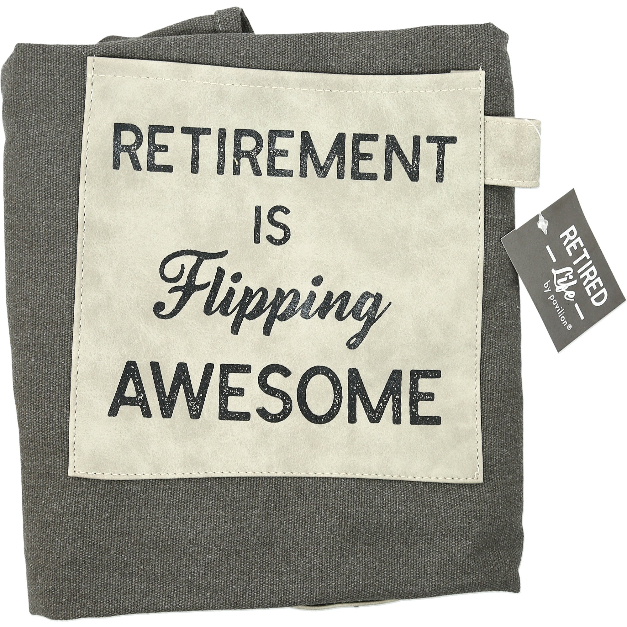 - IN-HOUSE DESIGN: Retirement is Flipping Awesome is printed onto the front of the apron on the center pocket of this 100% heavy duty cotton canvas tie-back apron. The three metal accent clips are securely attached to the front of the apron for easily clipping on all of your favorite grilling tools. The canvas strap around the neck is adjustable and has a metal slide for an easy adjusting. The apron ties in the back to ensure the apron stays put when you're flippin burgers! This one size fits all design takes the guesswork out of buying the right size. Adjust the neck, tighten or loosen the back ties and you're set to go. Make retirement even more awesome by gifting this apron!