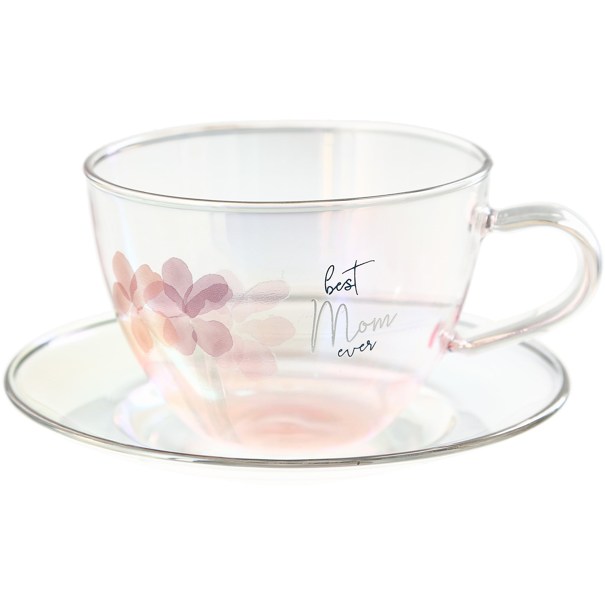 - IN-HOUSE DESIGN: Pink, orange, and purple watercolor paint-inspired flowers are accompanied by electroplated silver and teal "Best Mom Ever" sentiment decal on the front of the spray-painted pink ombre and iridescent cup. Electroplated silver detail surrounds the lip of the glass and the rim of the iridescent plate, prop 65 food-safe approved. The artwork was designed by artist Pam Vale who has always loved sheer, soft, and happy colors.