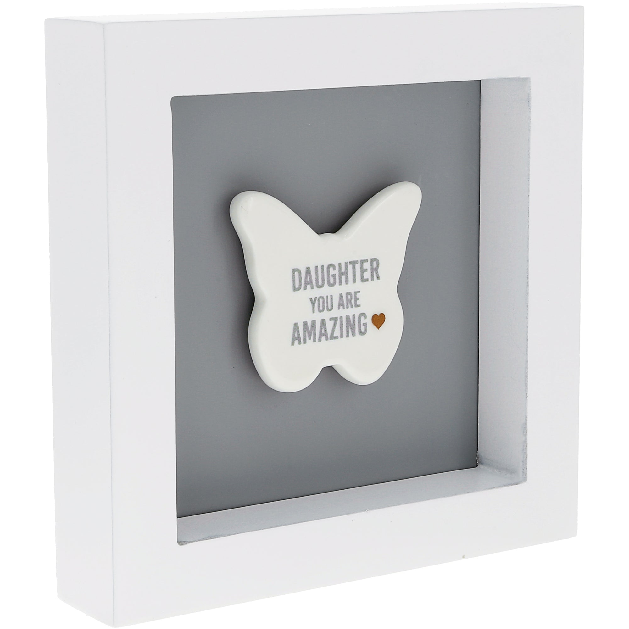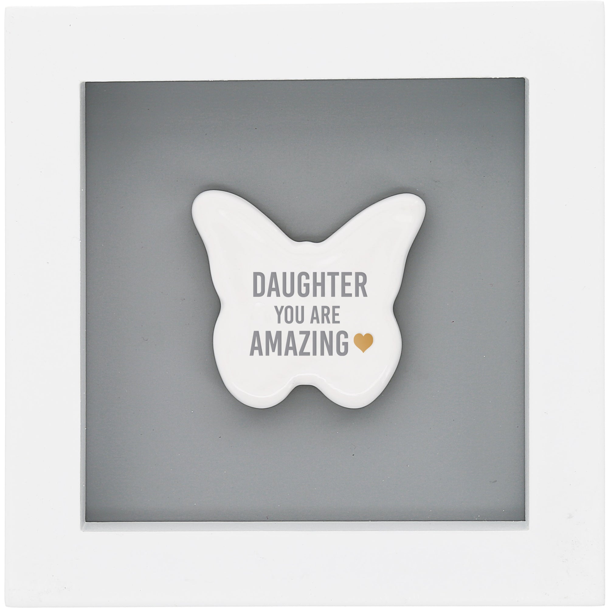 - IN-HOUSE DESIGN: Our in-house design features a striking matte gray background adorned with a 1.75" white 3D ceramic butterfly boasting a glossy finish. One golden metallic mini heart adds a touch of elegance, nestled within the heartfelt sentiments of "Daughter You Are Amazing."