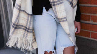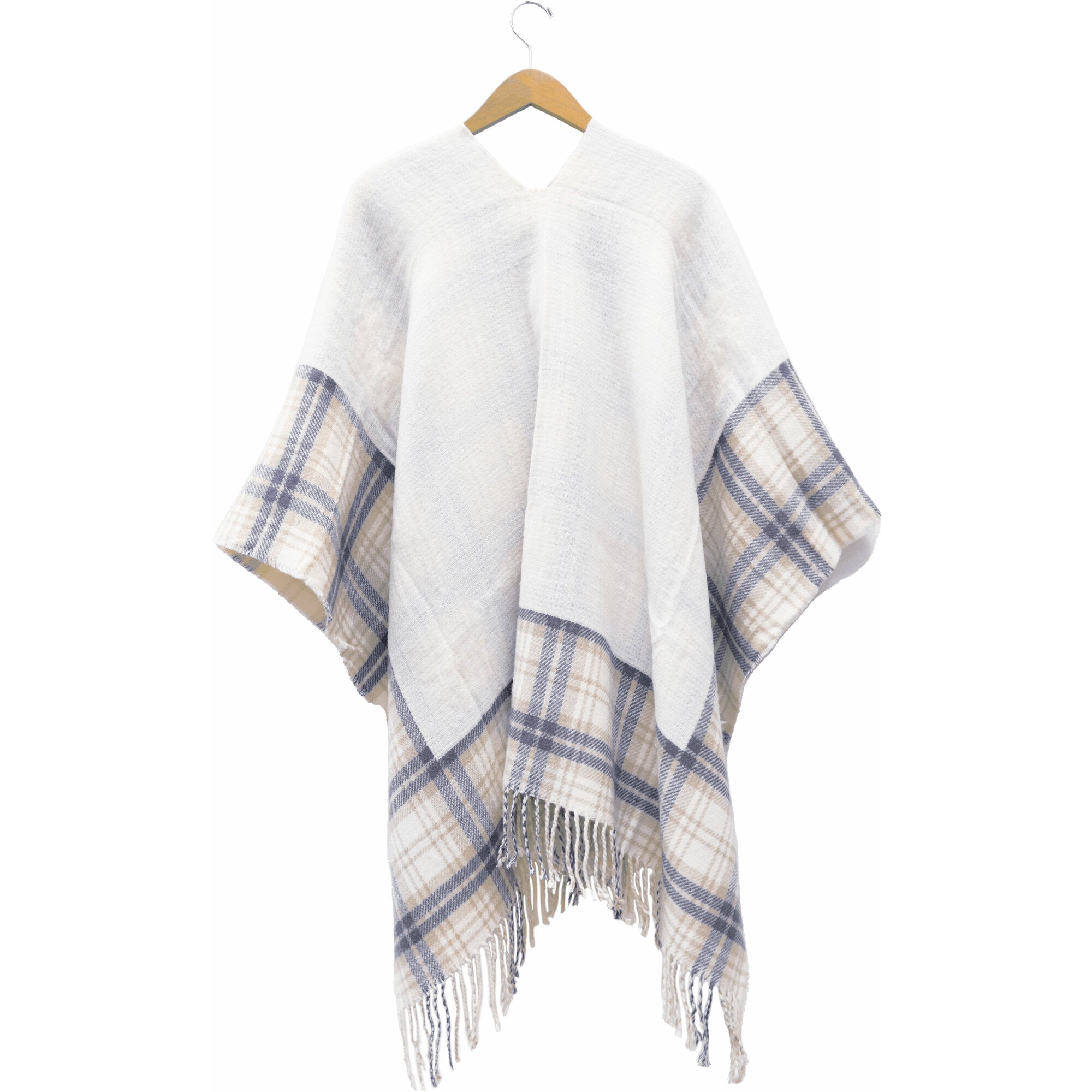 - IN-HOUSE DESIGN: Cream, light brown & gray provides an overall plaid checkered light crossed pattern. The interior is the opposite design - plaid on the top and cream on the bottom. The bottom edges have a 1-inch frayed skirting. If desired, the shawl can be flipped inside out with hidden buttons for a simpler look.