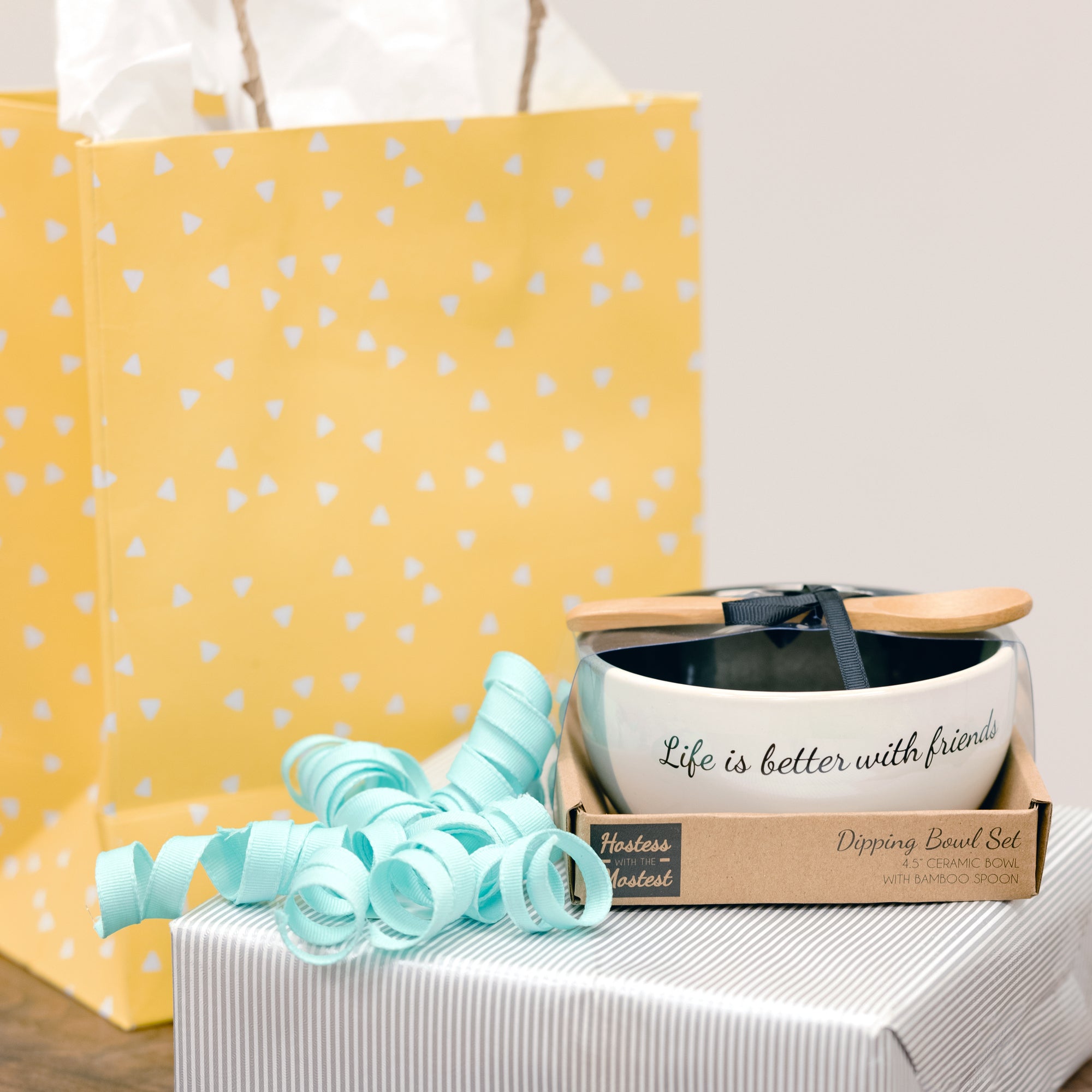 - IN-HOUSE DESIGN: You will see cursive written "Life Is Better With Friends" wrapping around the exterior brim of the mortar. The white, reactive blue, and navy blue glossy glazes fuse, making each bowl unique. The small light wood spoon fits comfortably into anyone's hand.