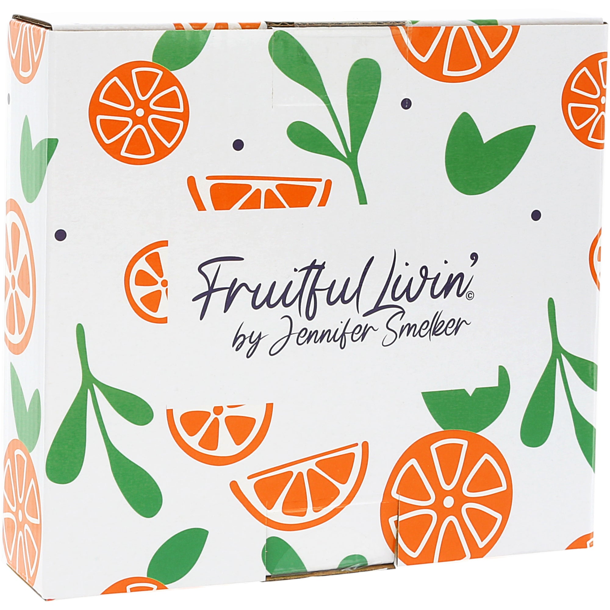 - IN-HOUSE DESIGN: Large and bold halved and wedged oranges are accompanied by greenery leaves and blue polka dots on a white background.