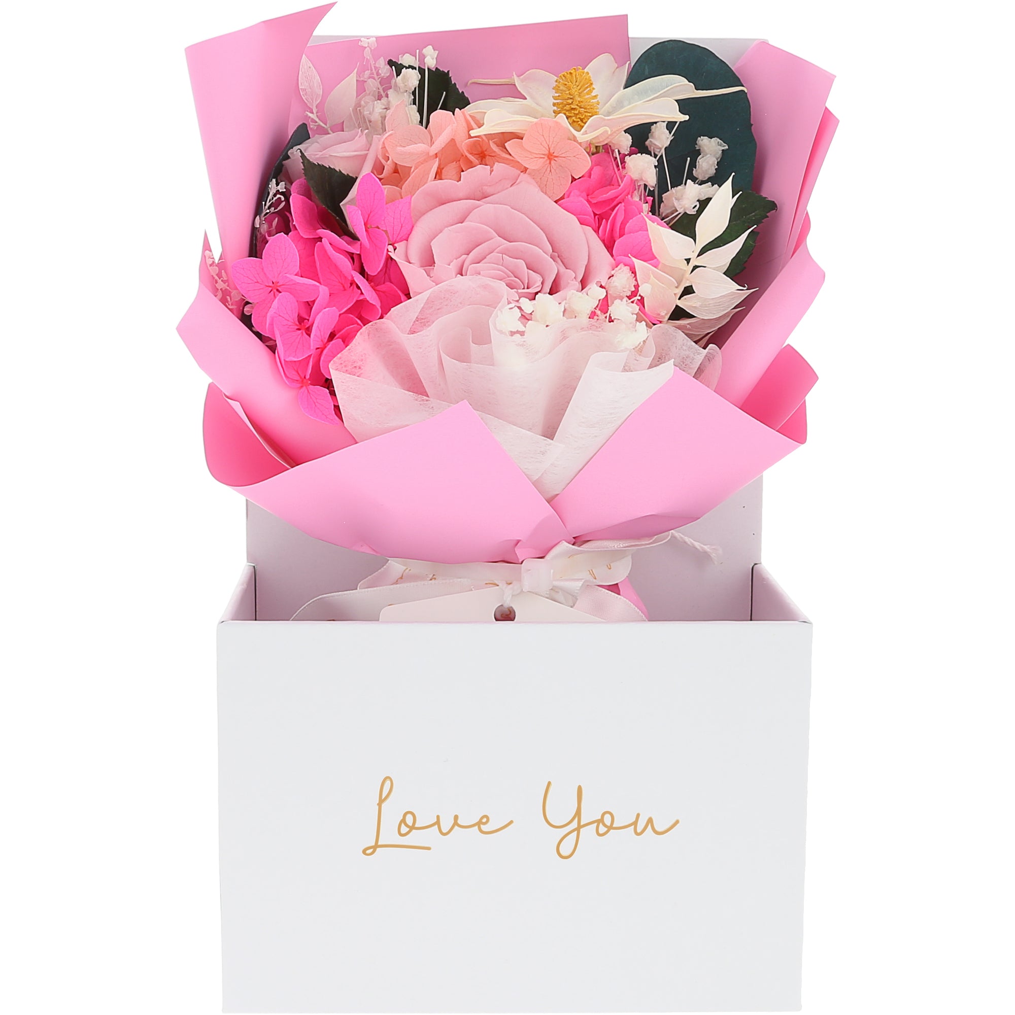 - PREMIUM QUALITY: This preserved flower bouquet is created from dried flowers that retain their natural beauty. Wrapped with paper and tied with a ribbon reading "Love You," it comes in a custom-designed gift box with gold accents, measuring 5.75" x 9.25" x 3.25". The inside sentiment reads, "Love you so much, these flowers are for you! Each petal a memory, each flower a bright hue~of the laughter & love and life that we've shared, your presence a gift, a flower so rare. Thank you for all that you do". The packaging enhances the bouquet, making it an ideal gift to express deep affection.