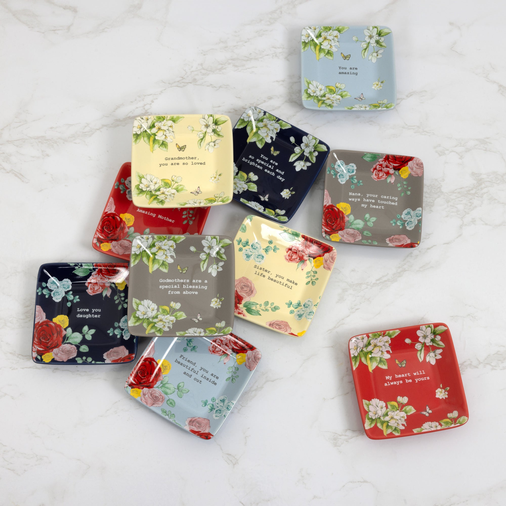 - IN-HOUSE DESIGN: The finish is glossy. The glossy sentiment in the gray "Sister, You Make Life Beautiful" is placed at the dish's center. The background is yellow with red, yellow, pink, blue, and greenery floral patterns.