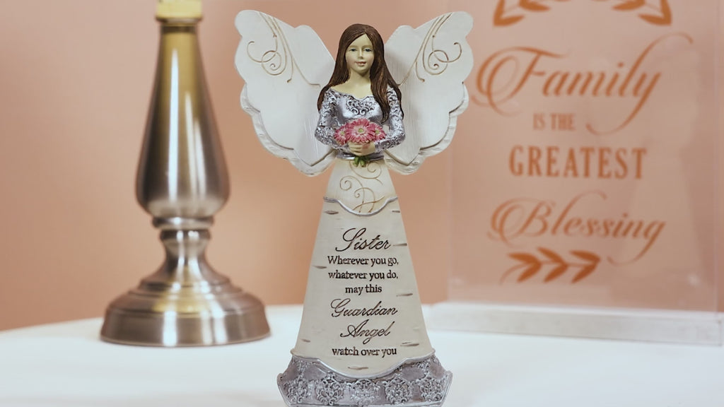 - IN-HOUSE DESIGN: "Sister Wherever You Go, Whatever You Do, May This Guardian Angel Watch Over You" text is debossed and painted onto the front of the angel, alongside an intricate silver design and flowers. The brown haired angel is holding a beautiful bouquet of pink flowers. There are foam pads on the bottom to prevent surfaces from being scratched.