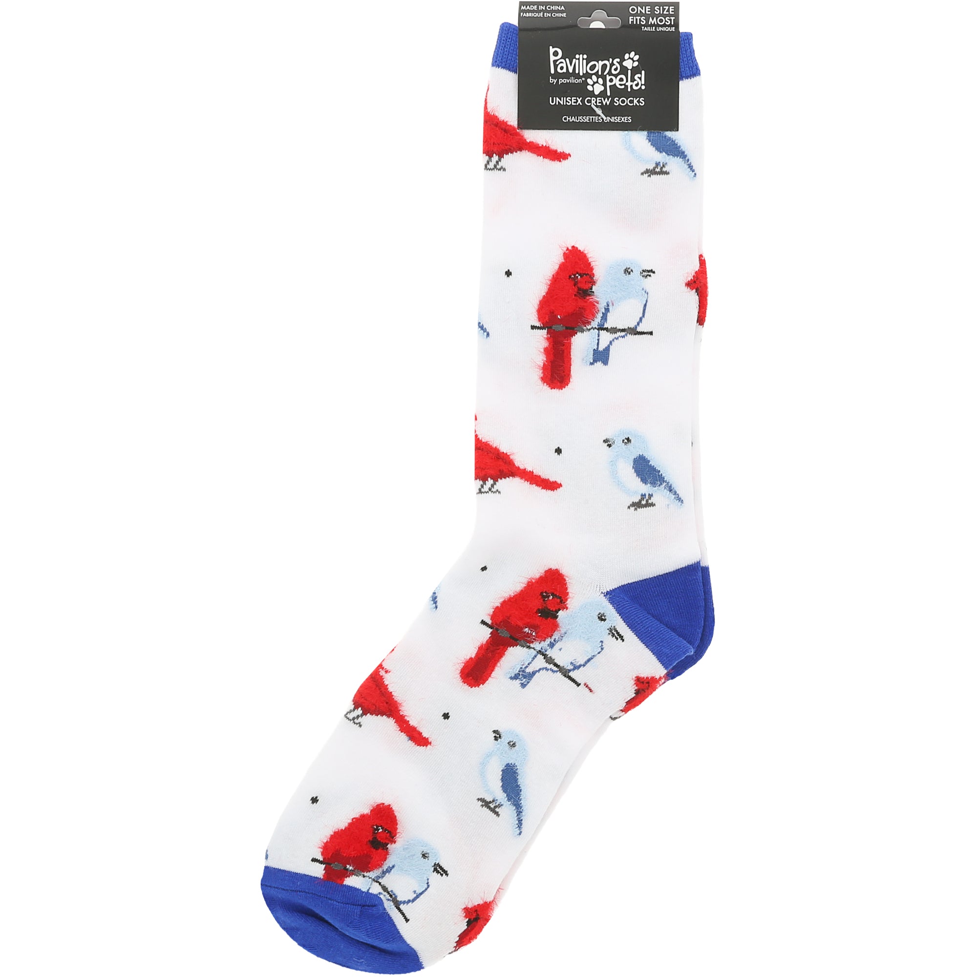 - IN-HOUSE DESIGN: Decorated with red cardinals, bluebirds, and other colorful songbirds perched on black wires, these socks use a bright white background to showcase vivid colors. Blue heel and toe accents provide a complementary touch that highlights the playful bird-themed palette.