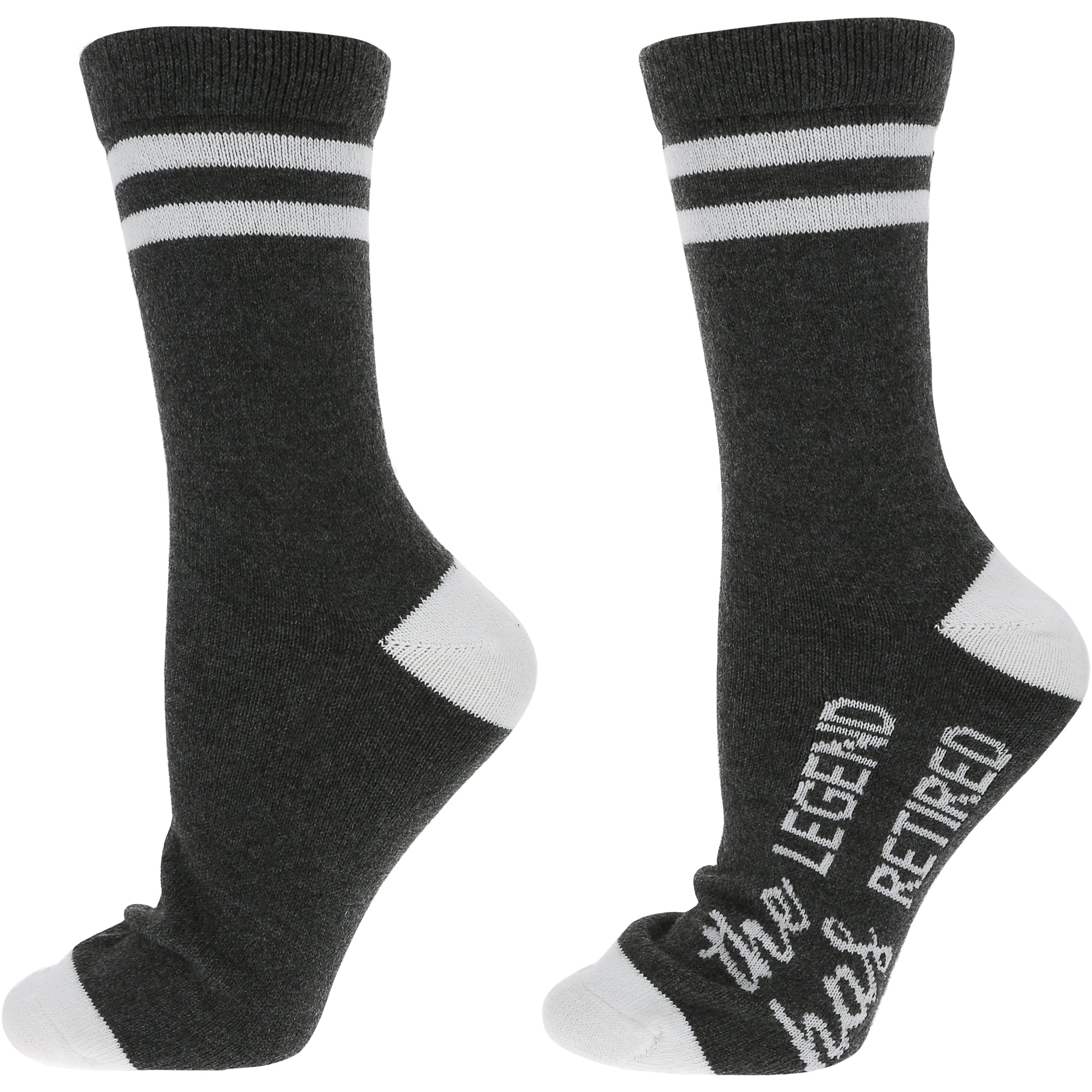 - IN-HOUSE DESIGN: The crew socks have a white ankle, toe & heel with a gray body and a white "The Legend Has Retired" sentiment on the outer lateral of the boot socks. The top of the crew socks have two stripes.