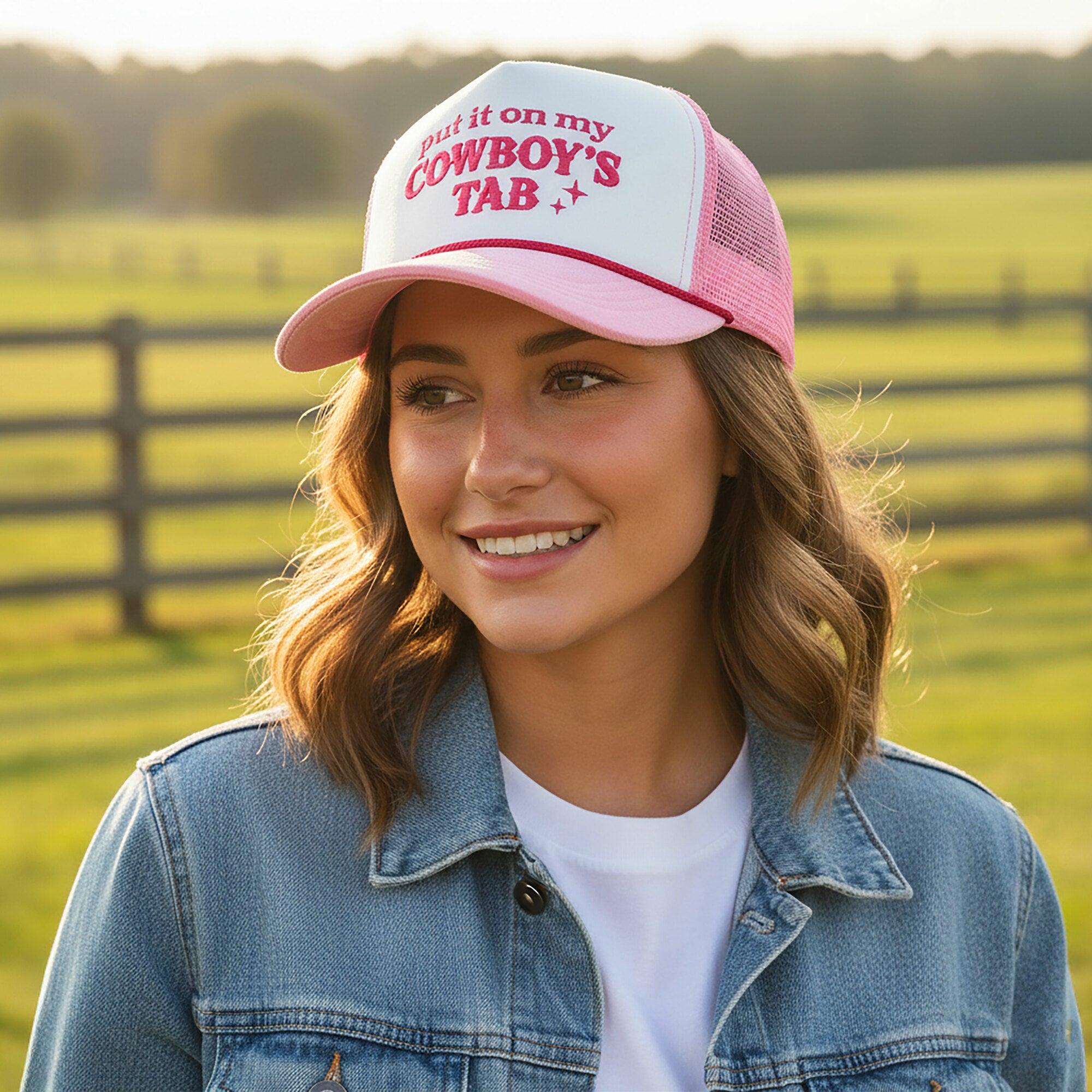 - IN-HOUSE DESIGN: Features bold pink 3D embroidered lettering reading “put it on my COWBOY’S TAB” accented with playful sparkle details. A coordinating pink brim, stitching, and mesh sides complete the feminine cowgirl look. The cotton string trim along the top brim adds a vintage western touch that fits perfectly with the Let’s Go Girls aesthetic.