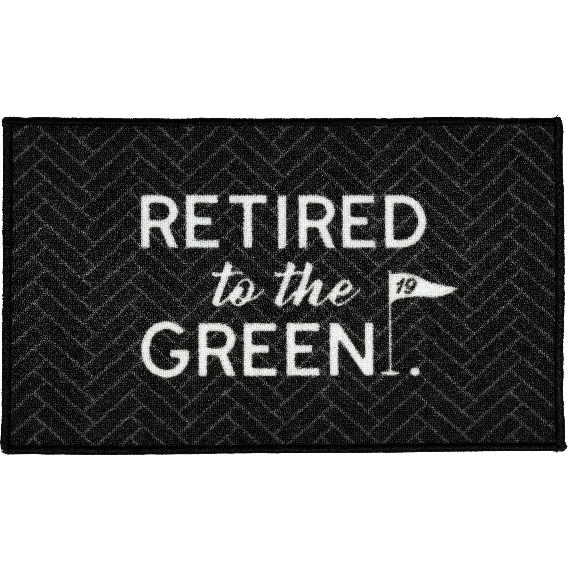- IN-HOUSE DESIGN: The gray rug has a herringbone printed pattern in light gray. The white "Retired To The Green" sentiment is accompanied by the "19" flag marker and golf ball.