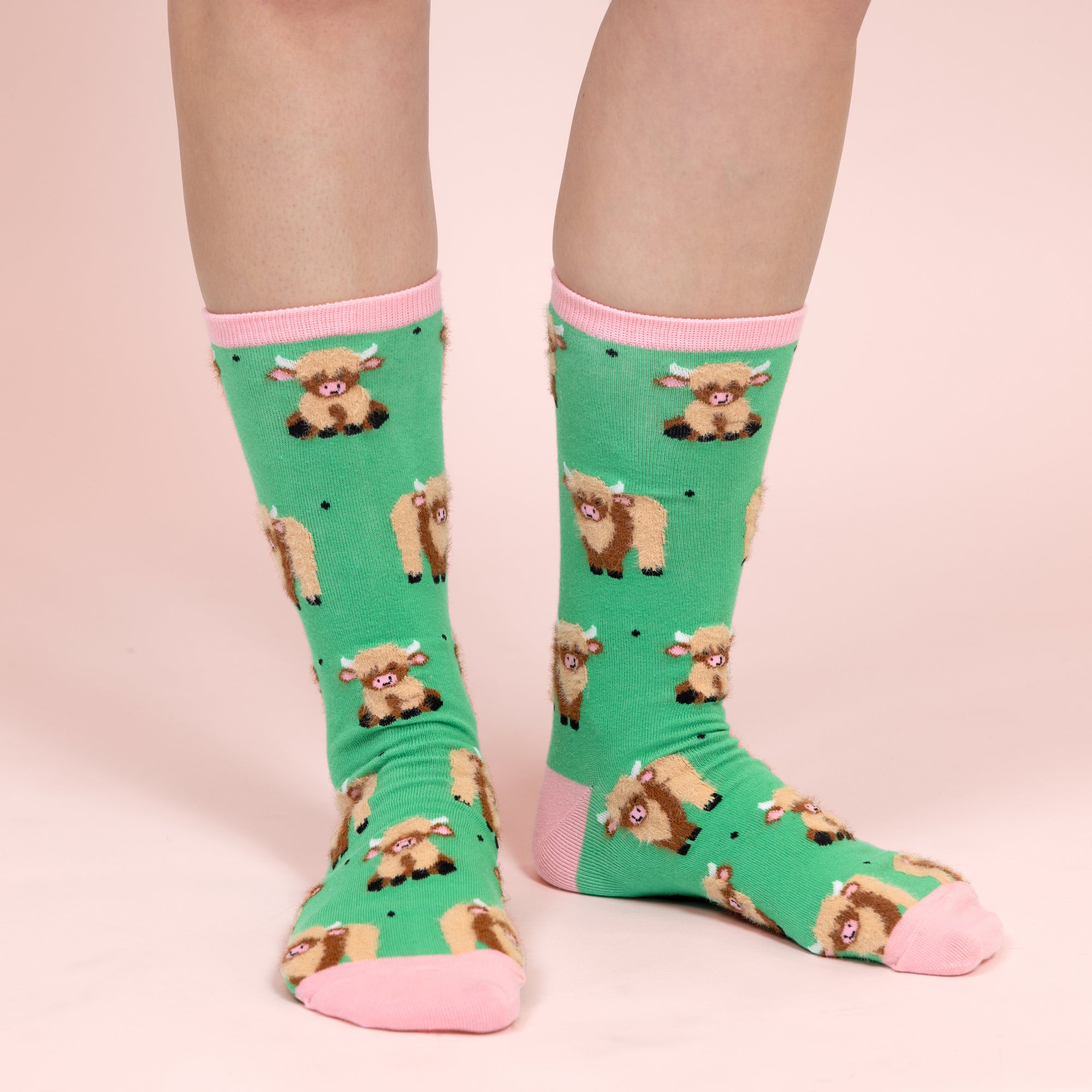 • IN-HOUSE DESIGN: Brown and tan highland cows smile and moo their way across a grassy green background, bringing barnyard personality and classic cow print charm to life. Pastel pink toes and heels offer a pop of color that enhances the bold look.
