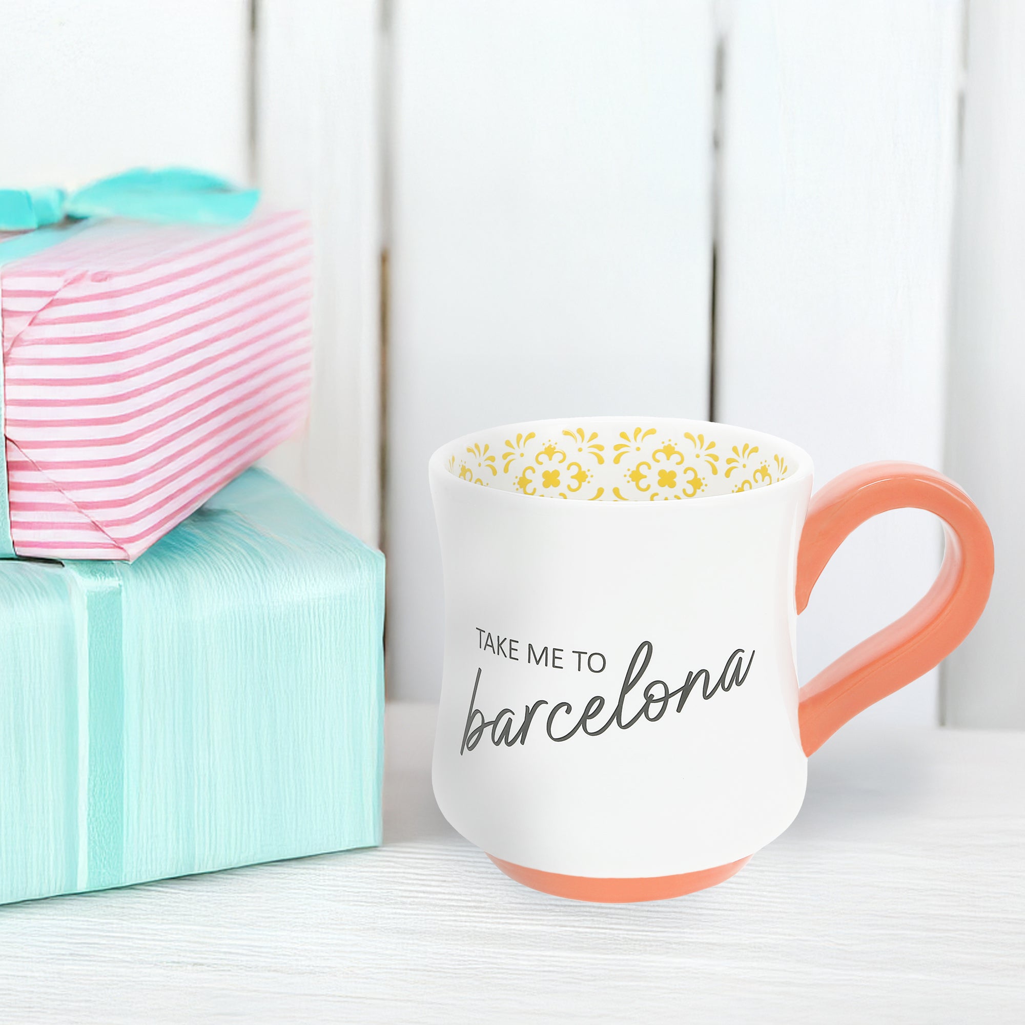 • IN-HOUSE DESIGN: Inspired by the artistic and vibrant spirit of Barcelona, this mug showcases a soft golden yellow and white tile interior pattern, a warm coral-red handle, and the phrase "Take Me to Barcelona" elegantly scripted on the front. The bright colors and intricate design evoke the charm of the Catalonian capital.
