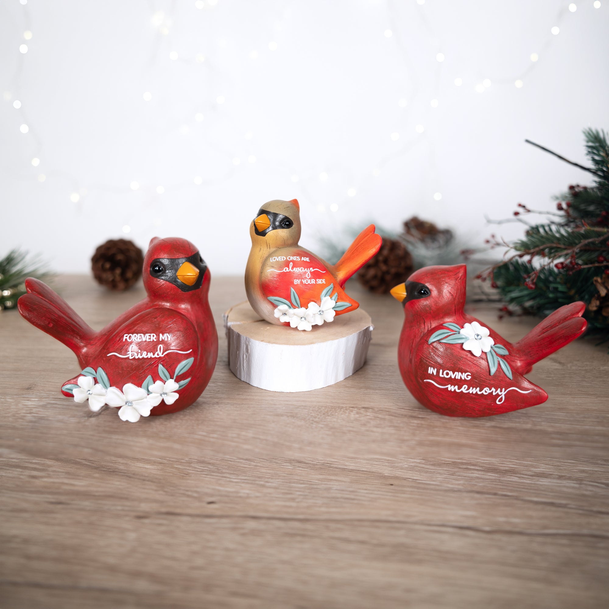 - IN-HOUSE DESIGN: The bird's black face has an orange beak, and the body has brown, red, white, and yellow accents. The white 3D flowers have crystal accents at the flower centers, with green 3D leaves surrounding them. The white "Loved Ones Are Always By Your Side" is debossed into the top of the bird's wing.
