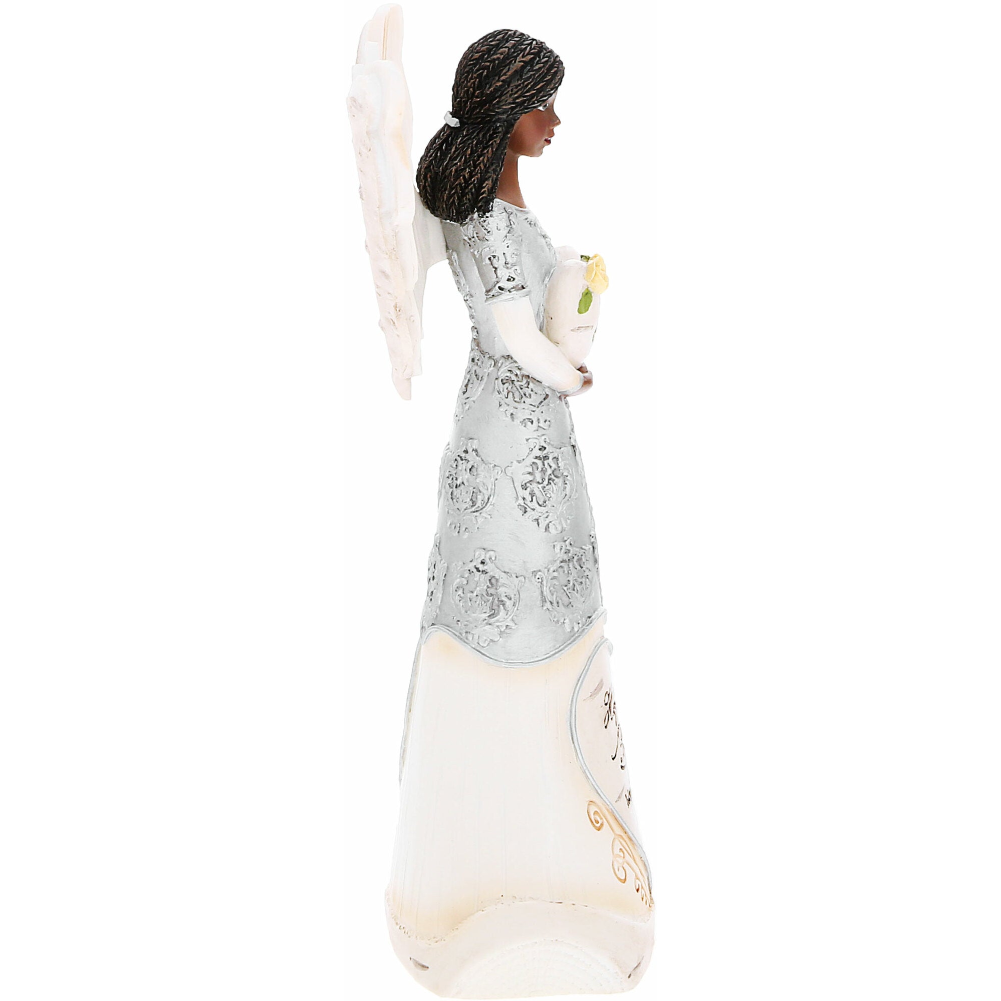 - IN-HOUSE DESIGN: The "Happy 50th Birthday May Today's Wishes Fill Your Life With Happiness" sentiment is carved in cursive on the center of the bottom half of the dress within a heart and next to some yellow roses. The angel statue holds a heart above her chest with "50." Her beautiful mid-length hair rests neatly on her shoulders and back. The silver damask-styled silver details bring her to life.