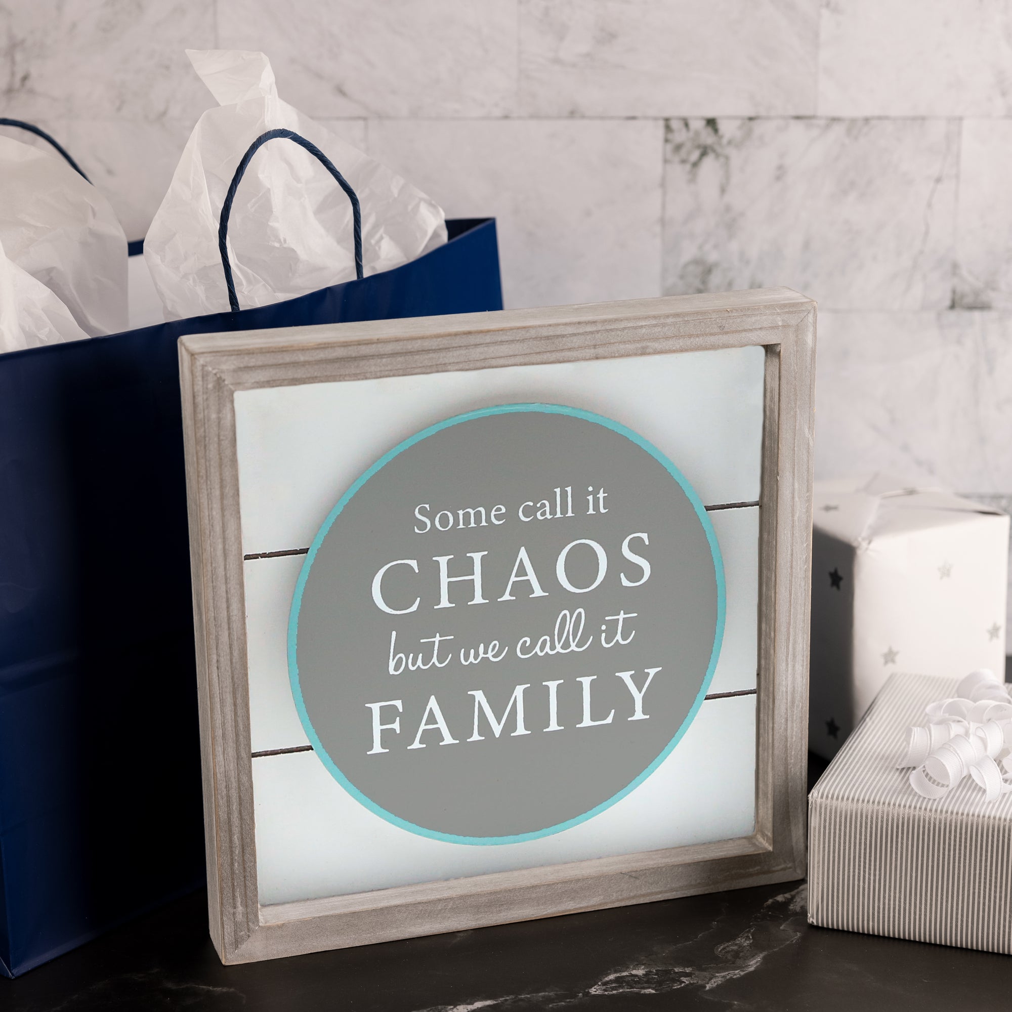 - IN-HOUSE DESIGN: Whitewashed pine rustic-style edges accompany a white shiplap backdrop, a gray box, and light blue edging. "Some Call It Chaos But We Call It Family" sentiment is printed on the raised gray center.