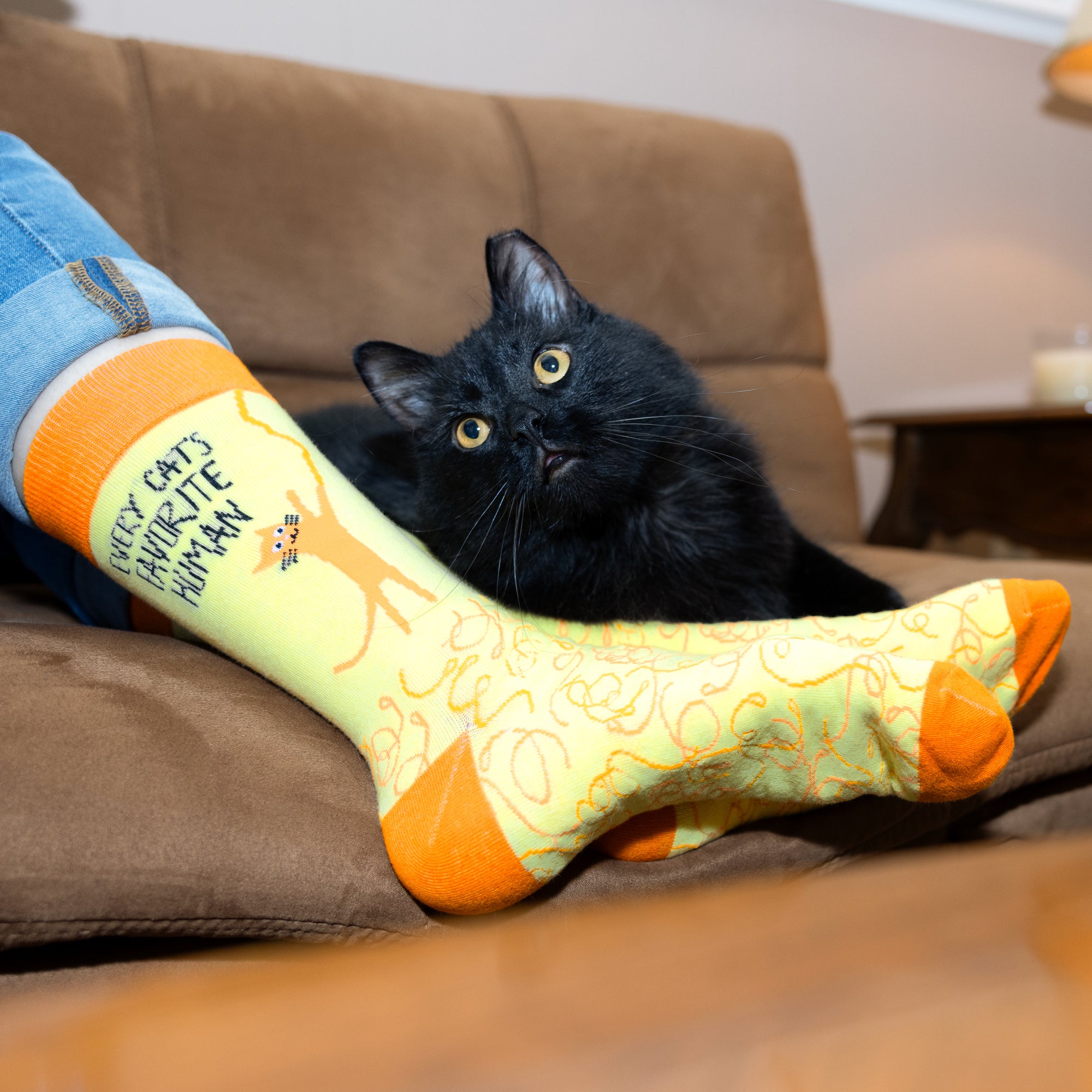 - IN-HOUSE DESIGN: The yellow body has orange string patterns accompanied by a black "Every Cat's Favorite Human" sentiment on the outer ankle of each sock. The orange cat plays with a yarn string next to and below the wording. The ankle, heel, and toe are all orange.